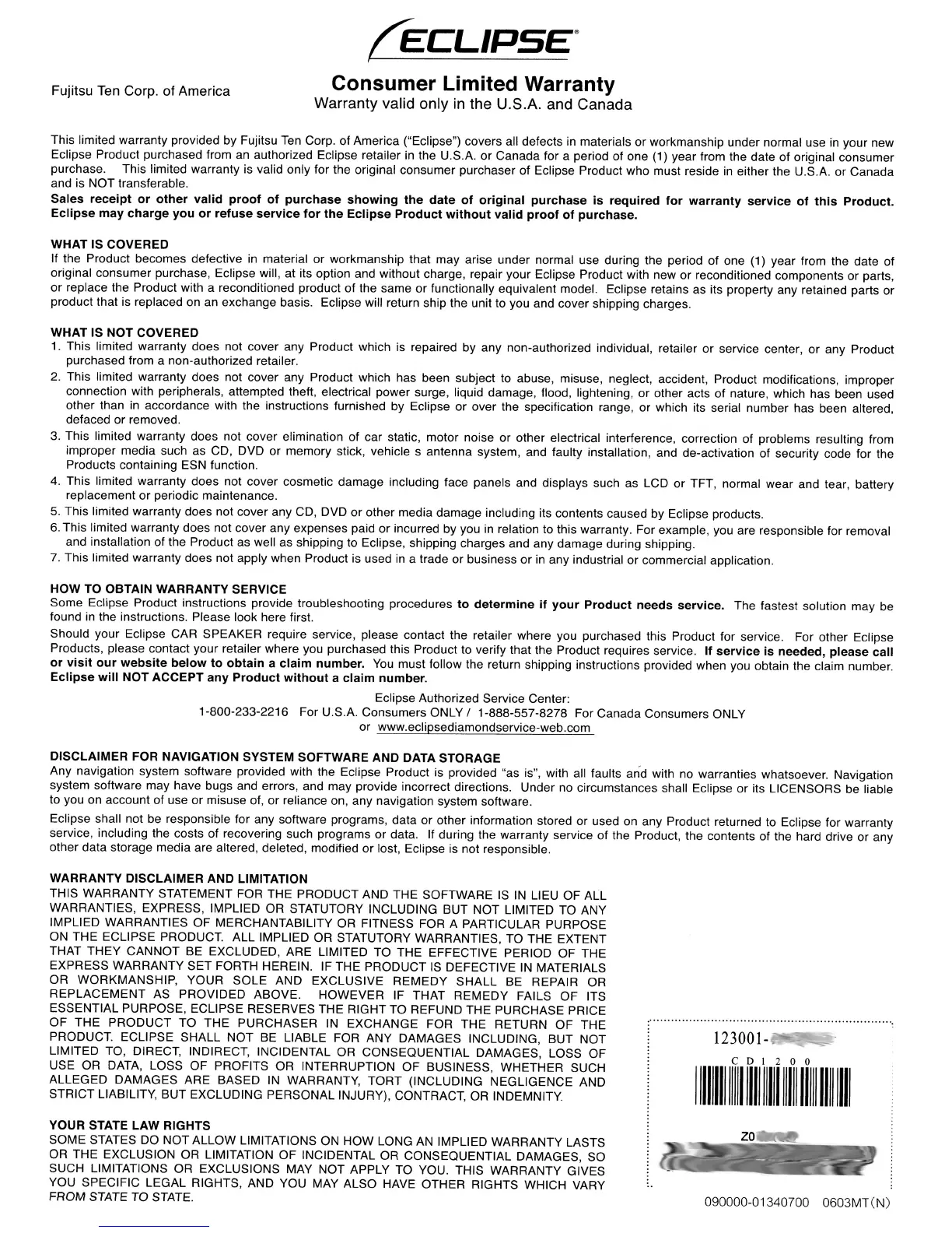 Should your Eclipse CAR SPEAKER require service, please contact the retailer where you purchased this Product for service. For other Eclipse