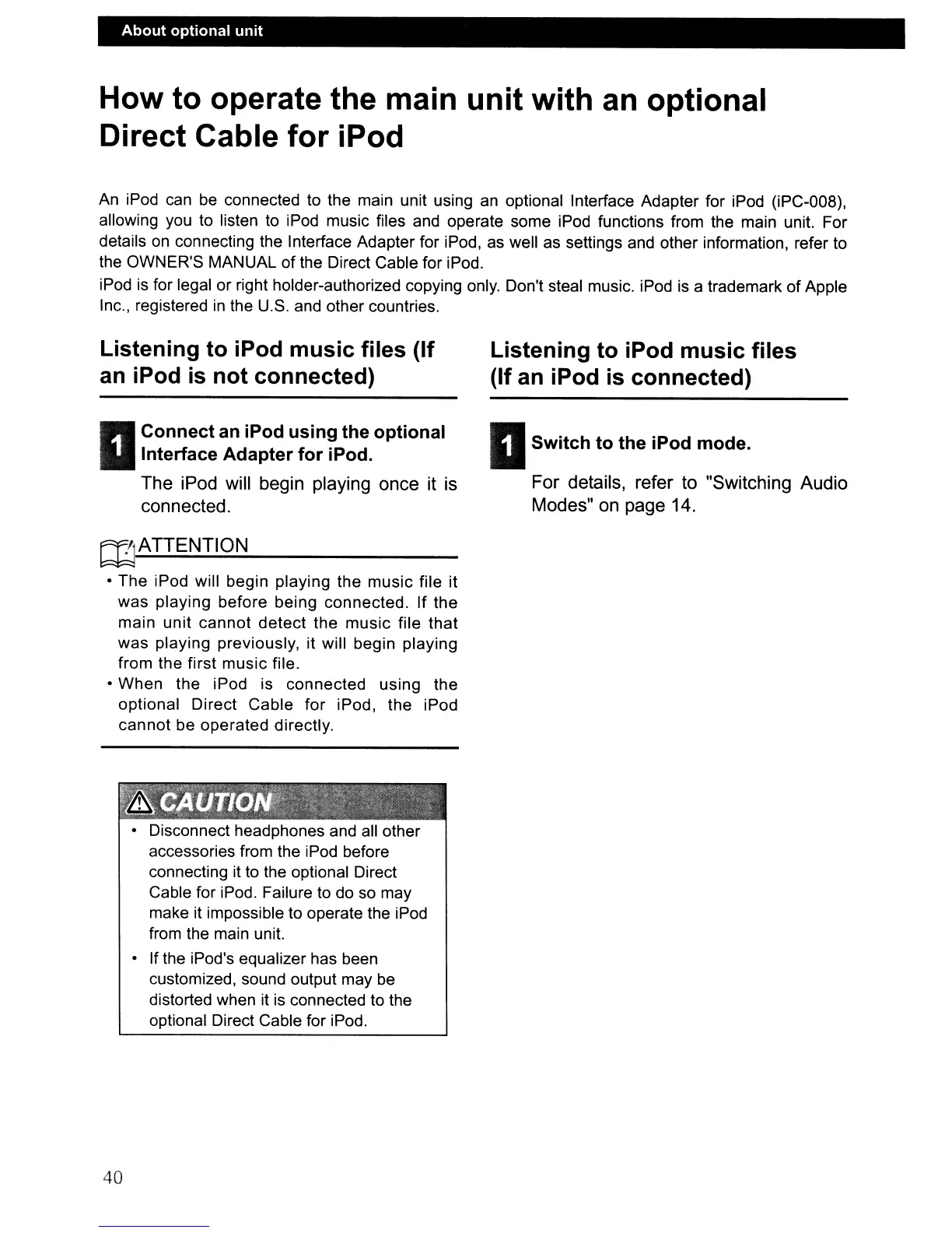 iPod can be connected to the main unit using an optional Interface Adapter for iPod (iPC-008),