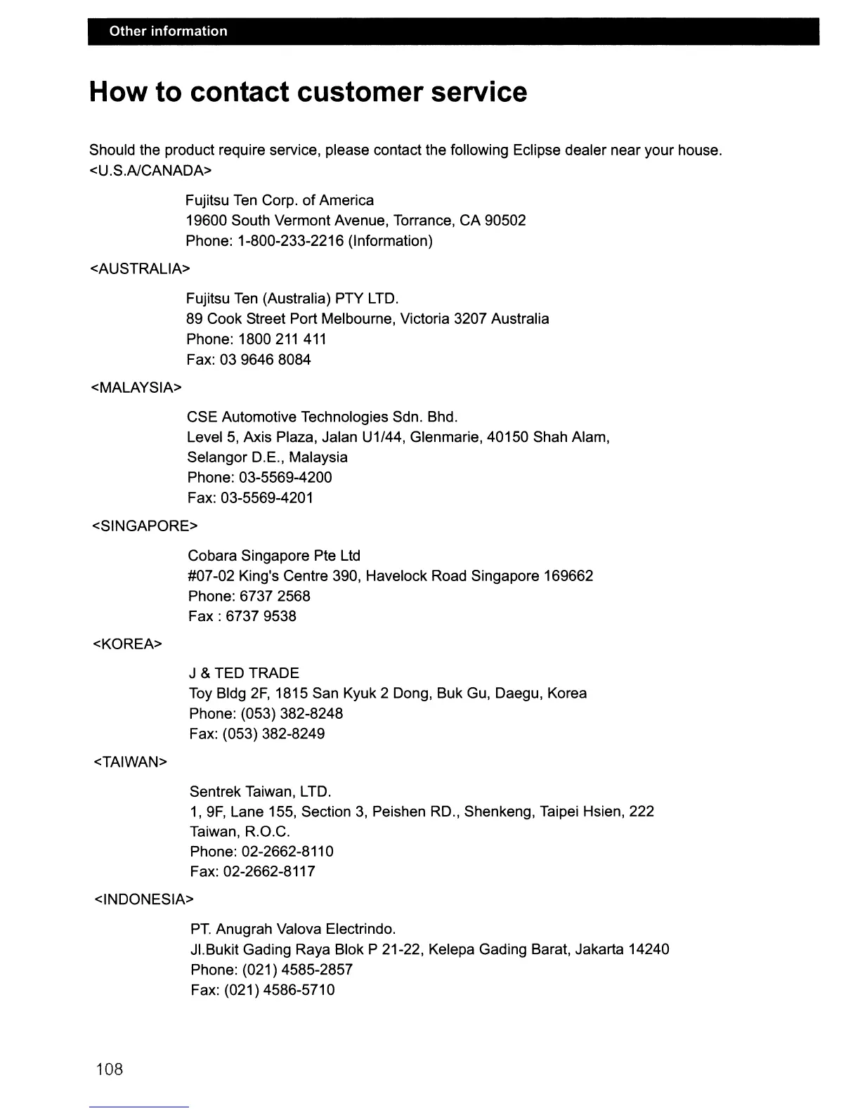 Should the product require service, please contact the following Eclipse dealer near your house.