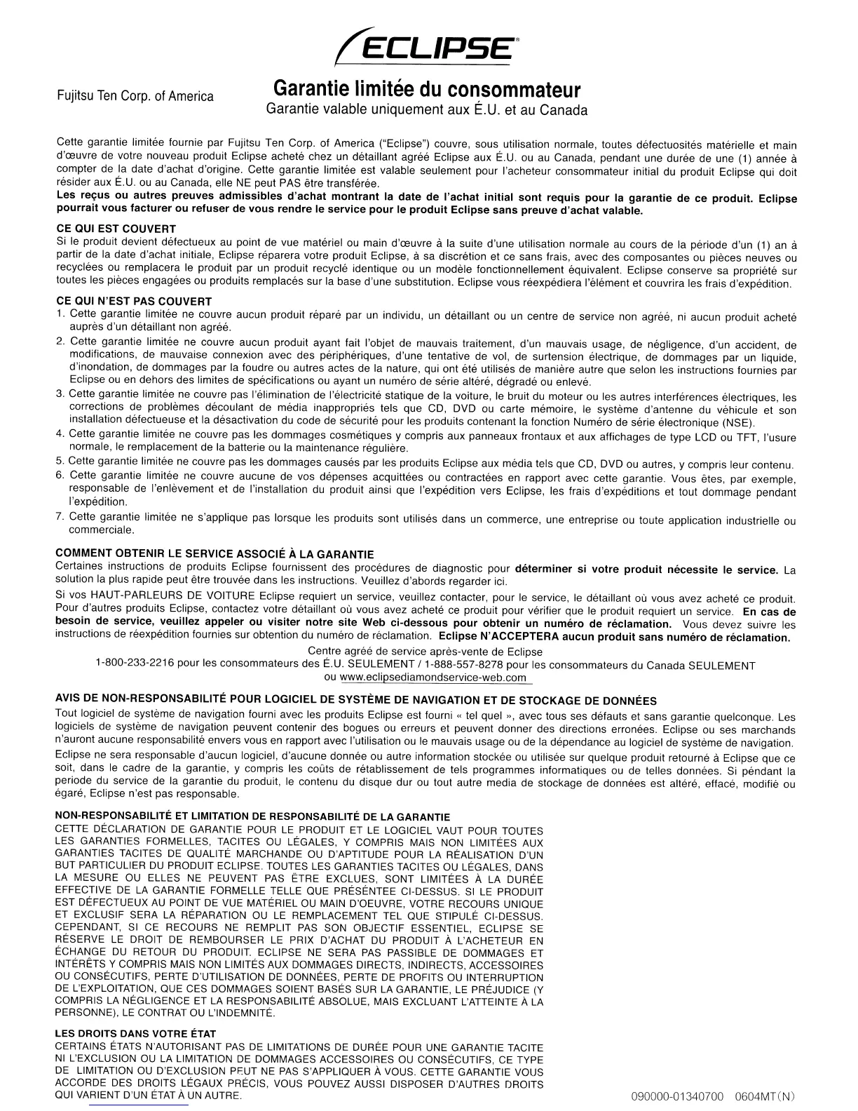 Cette garantie limitee fournie par Fujitsu Ten Corp. of America ("Eclipse") couvre, sous utilisation normale, toutes defectuosites materielle et main