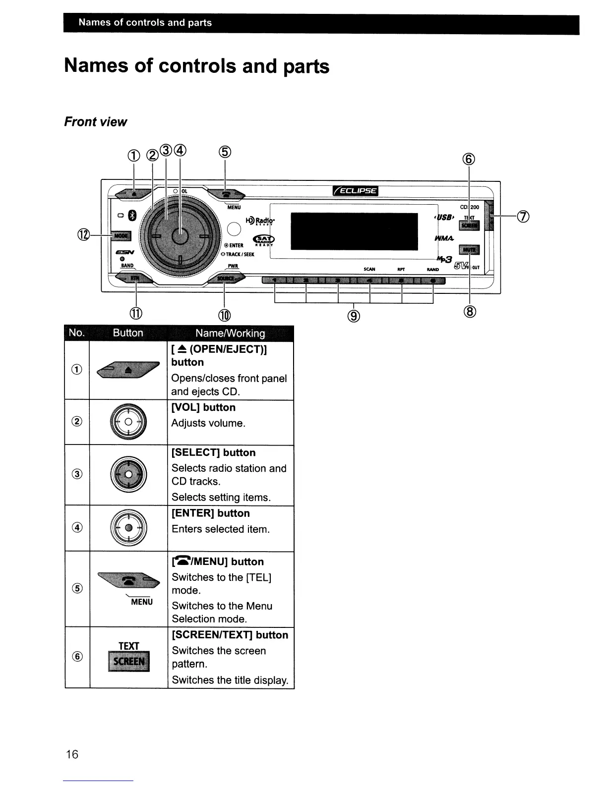 Names of controls and parts