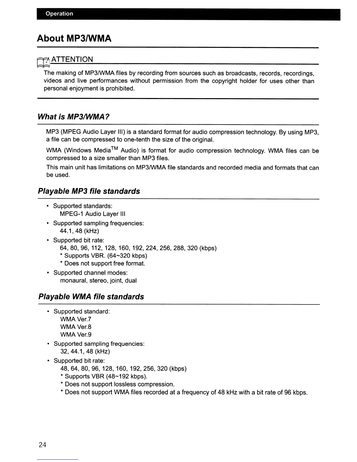 This main unit has limitations on MP3IWMA file standards and recorded media and formats that can