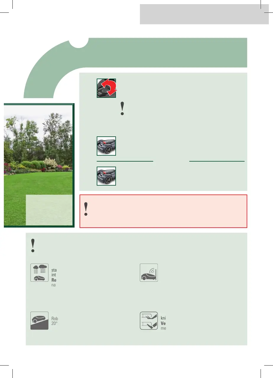 The robot returns to the charging station on its own for charging. Automatic resumption of mowing.