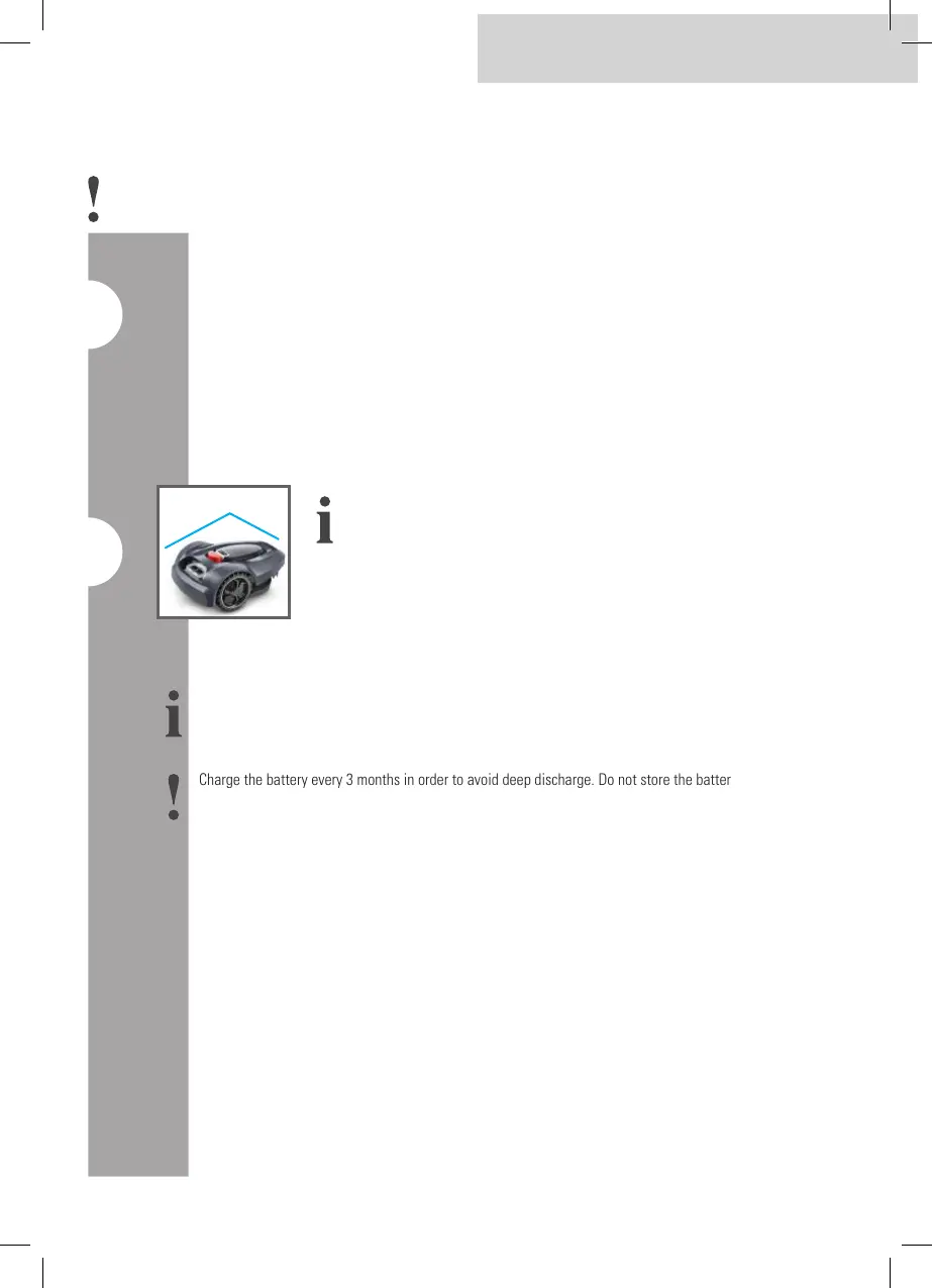 Charge the battery every 3 months in order to avoid deep discharge. Do not store the battery in