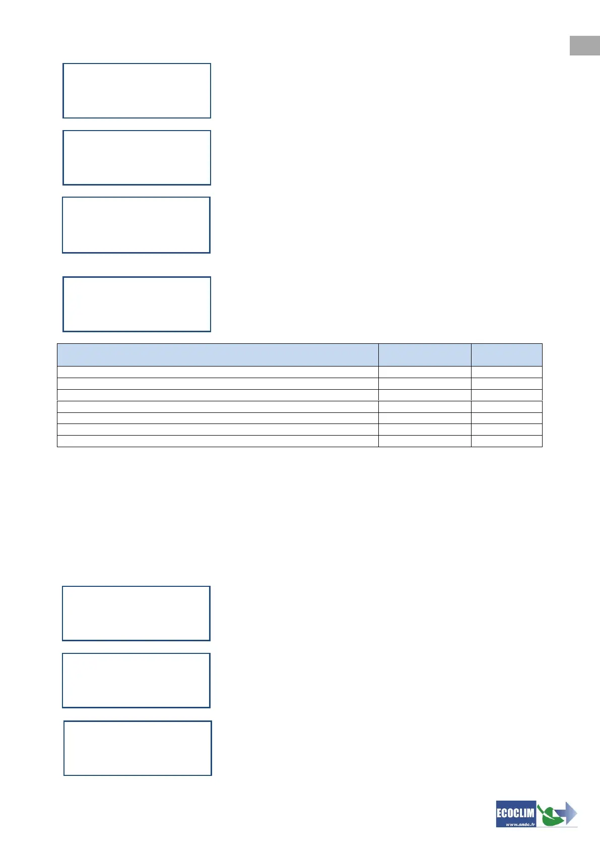 Consult the table below for the access codes corresponding to settings or