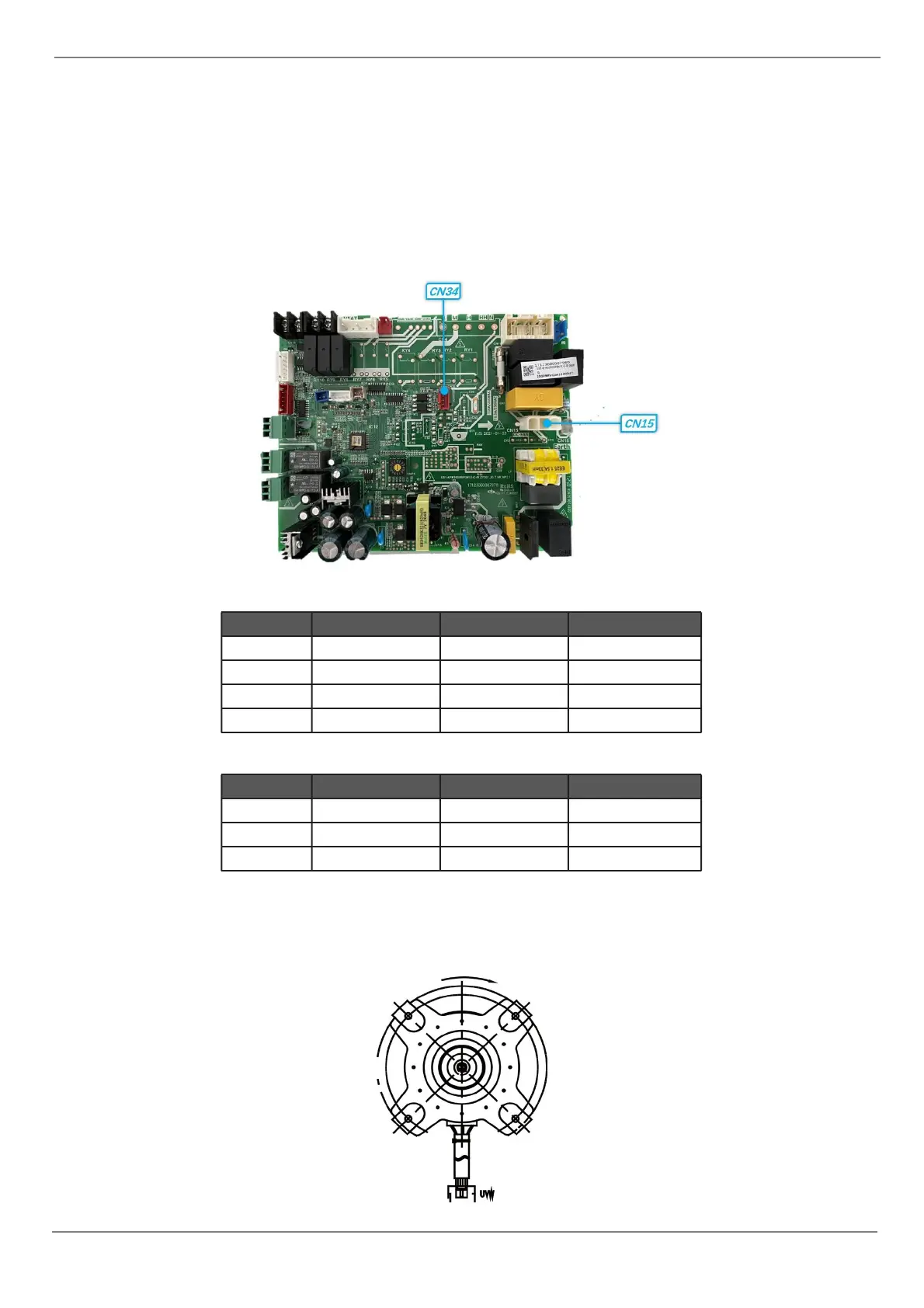 Power on and when the unit is in standby, measure the voltage of pin1&pin2 of CN15, pin3 of CN34 in fan