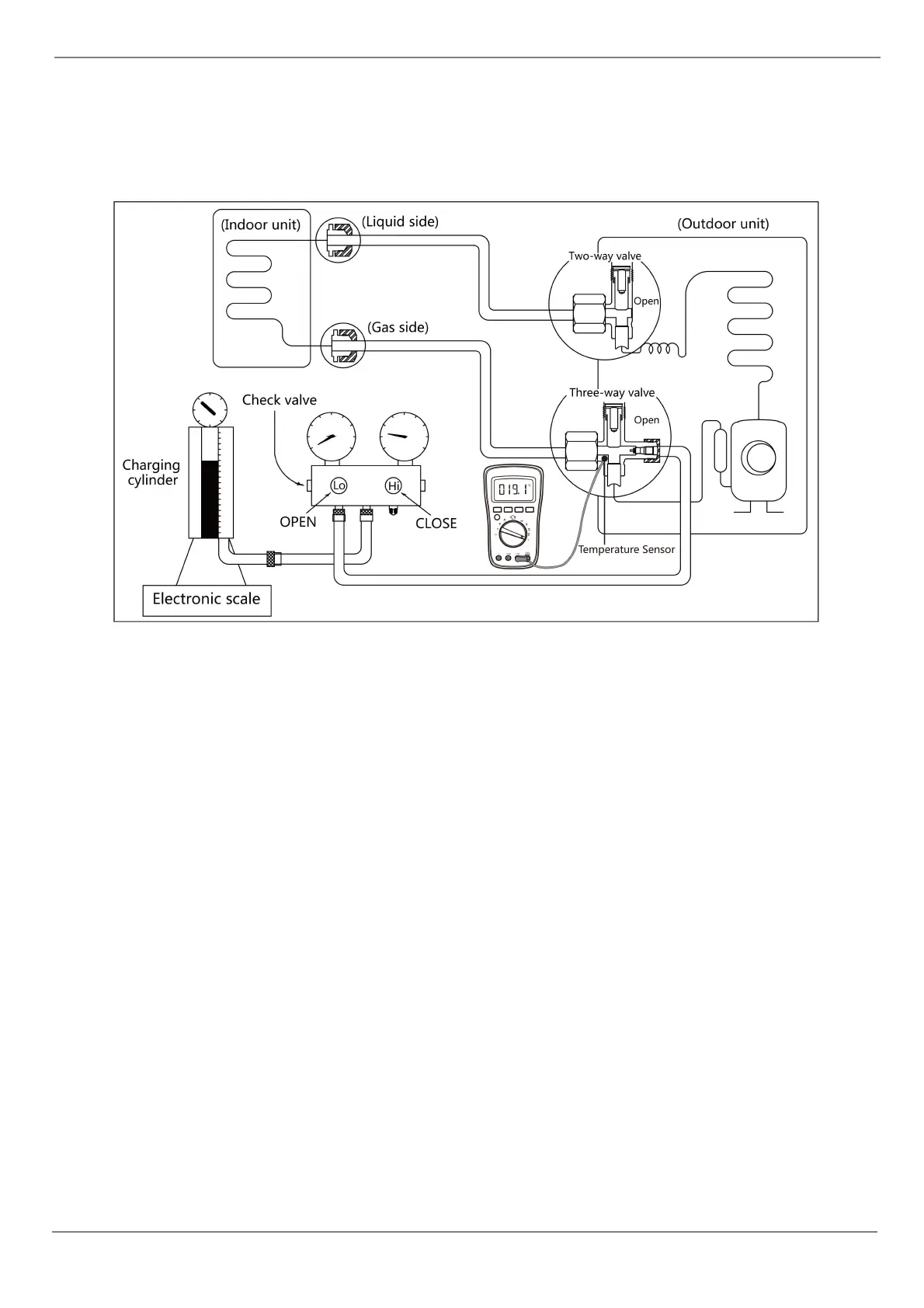 9. When the electronic scale displays the correct weight (refer to the gauge and the pressure of the low side