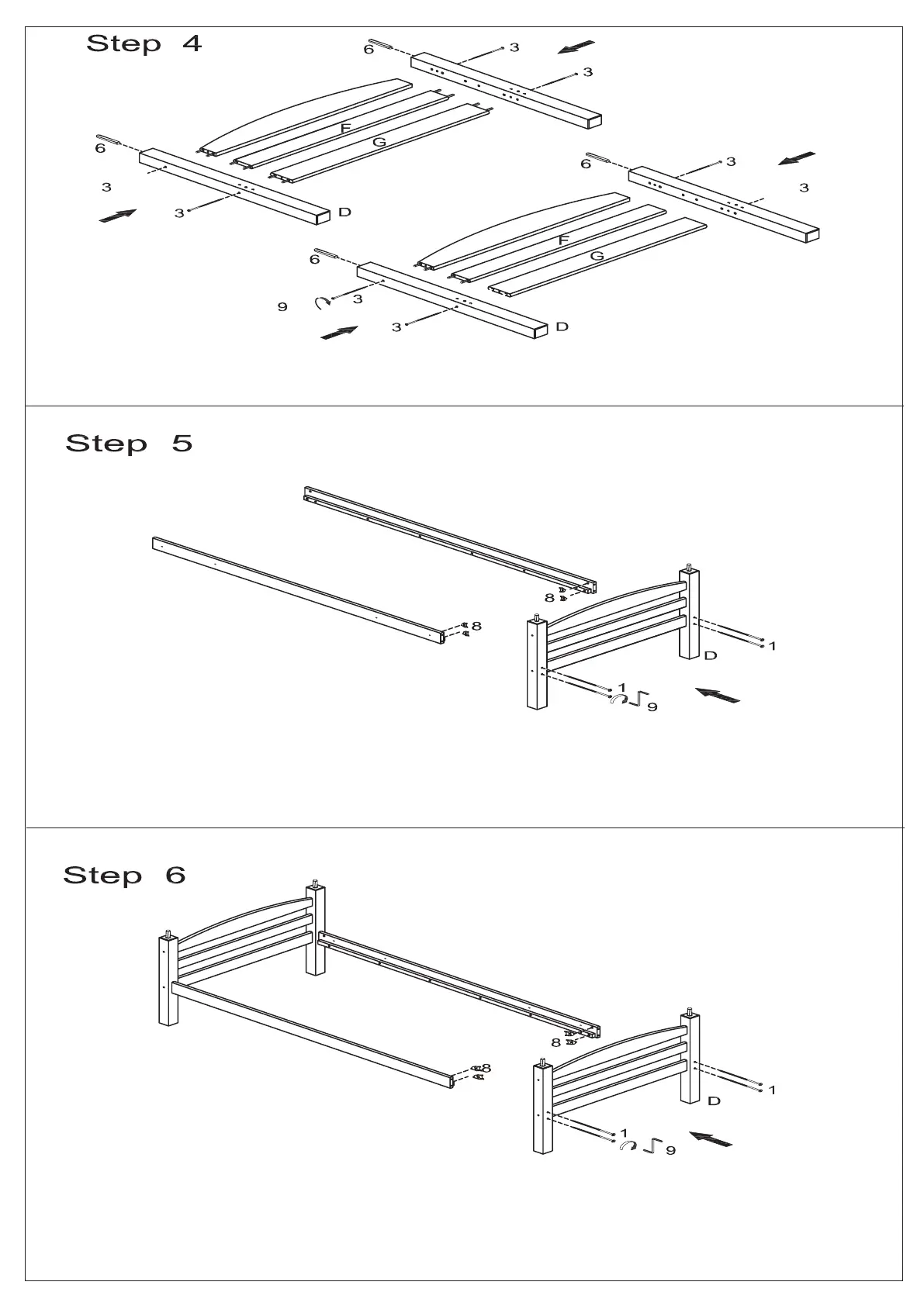 slats (E,F,G) using wood joint connectors (3). Insert wood dowels (6) into both sets of legs (E,D).