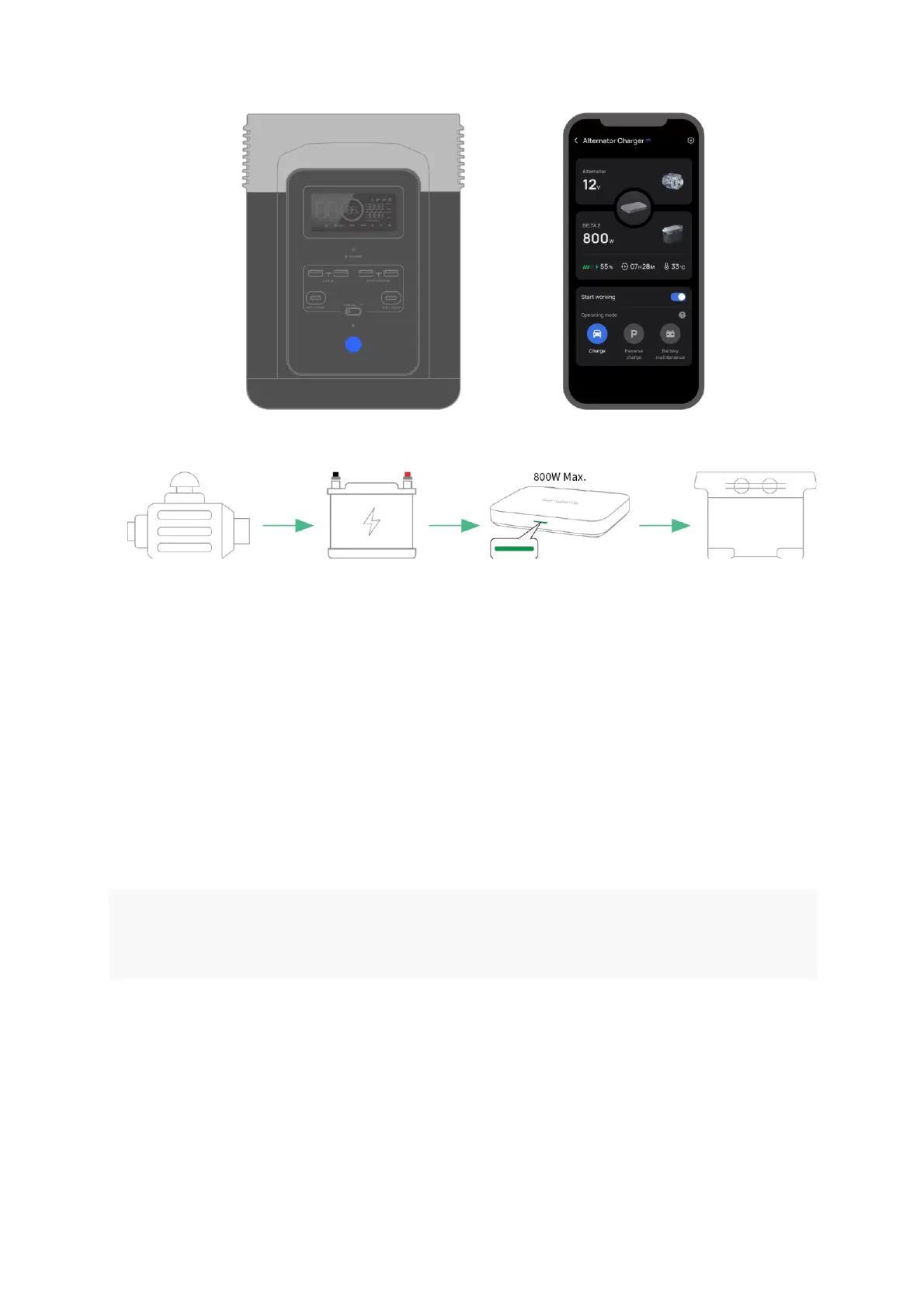 • Power Flow: Portable Power Station or Extra Battery → Alternator Charger → Vehicle Starter