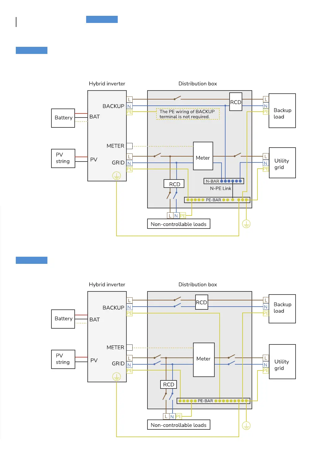 • N and PE wiring via GRID and BACKUP ports of the inverter vary based on the