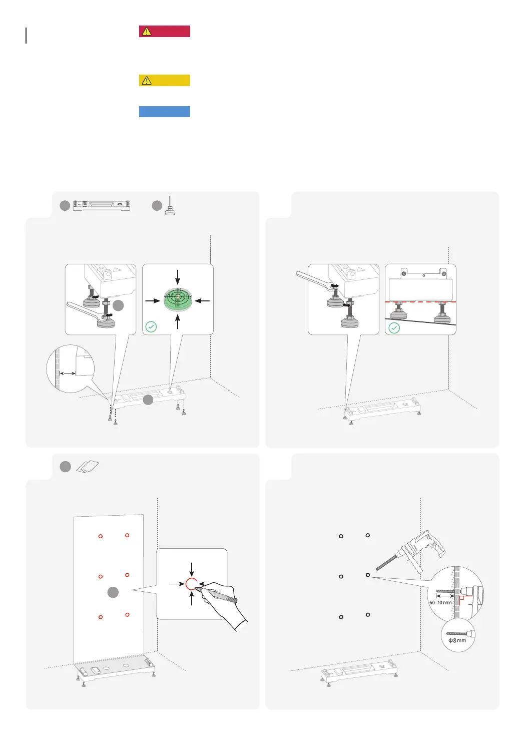 • When drilling holes, avoid the water pipes and power cables buried in the wall and