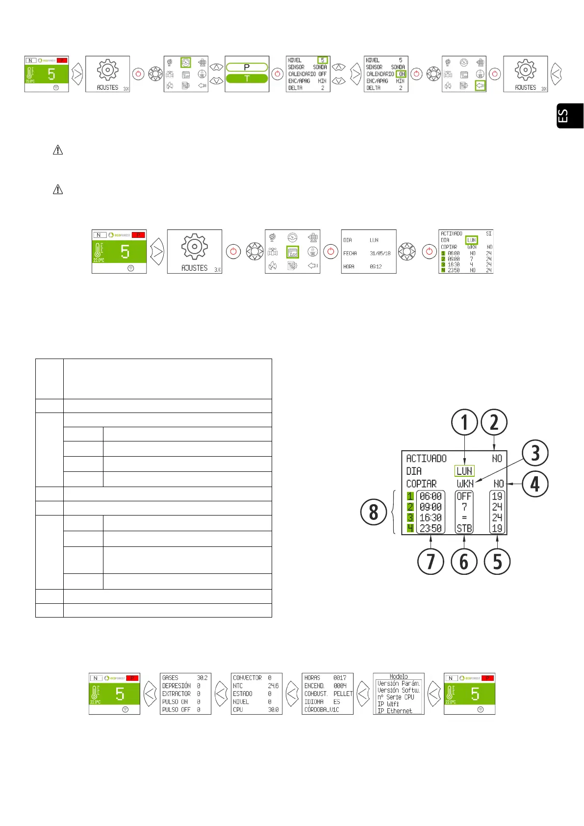 actual. El teclado permite ajustar desde el menú el día de la semana, la fecha (DD/MM/AA) y la hora (HH:MM