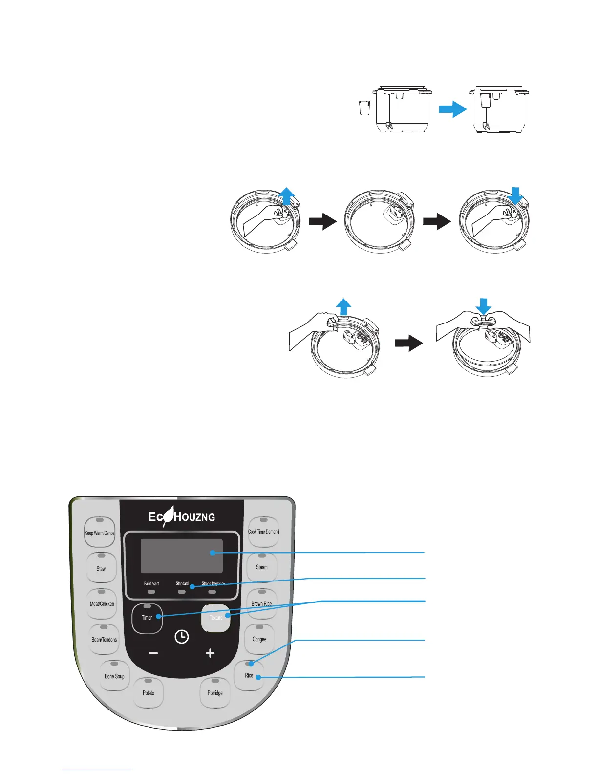 The control panel of your electric pressure cooker consists of an LED display, 3 mode