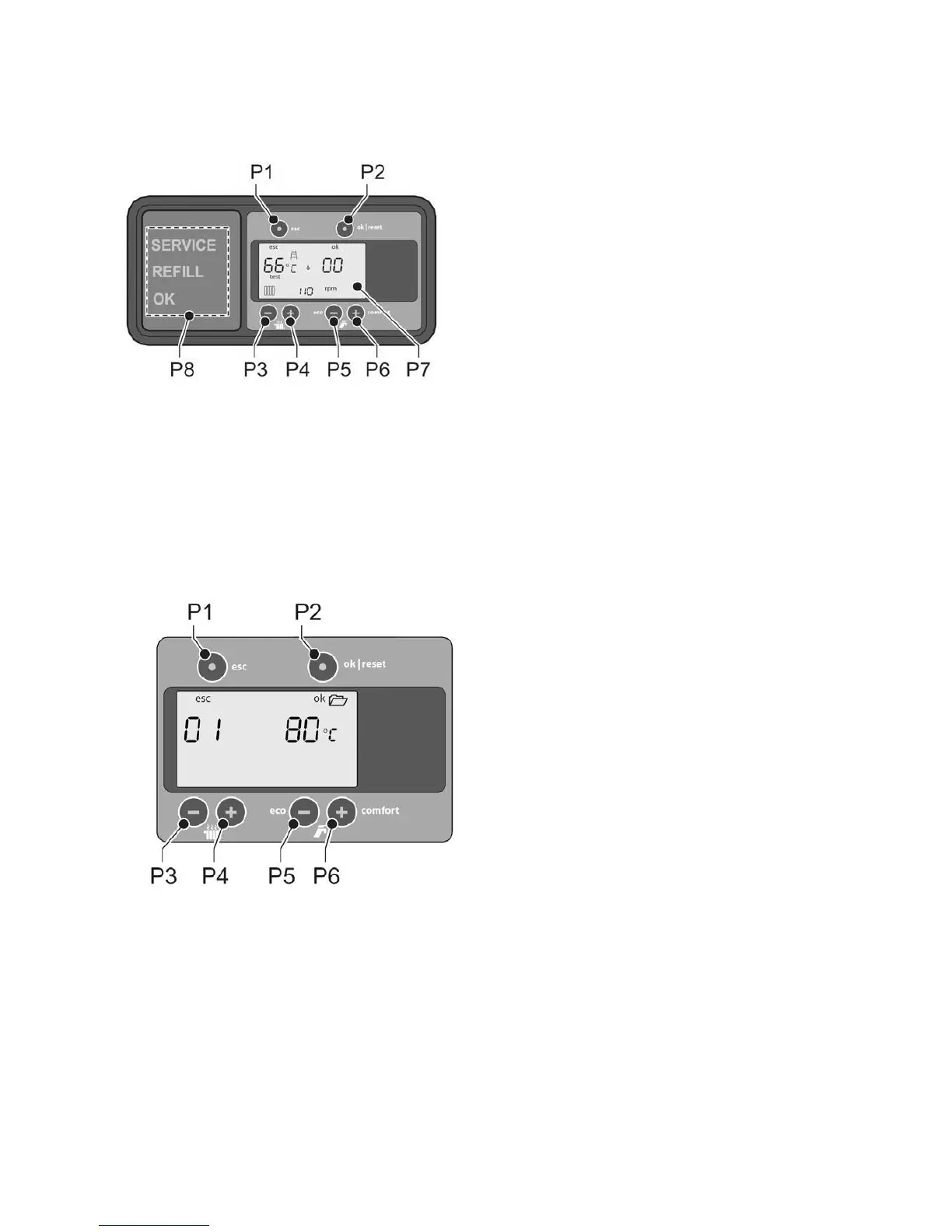 P5: eco / ecomfort down (tap symbol). Ecomfort only with OpenTherm® thermostat.
