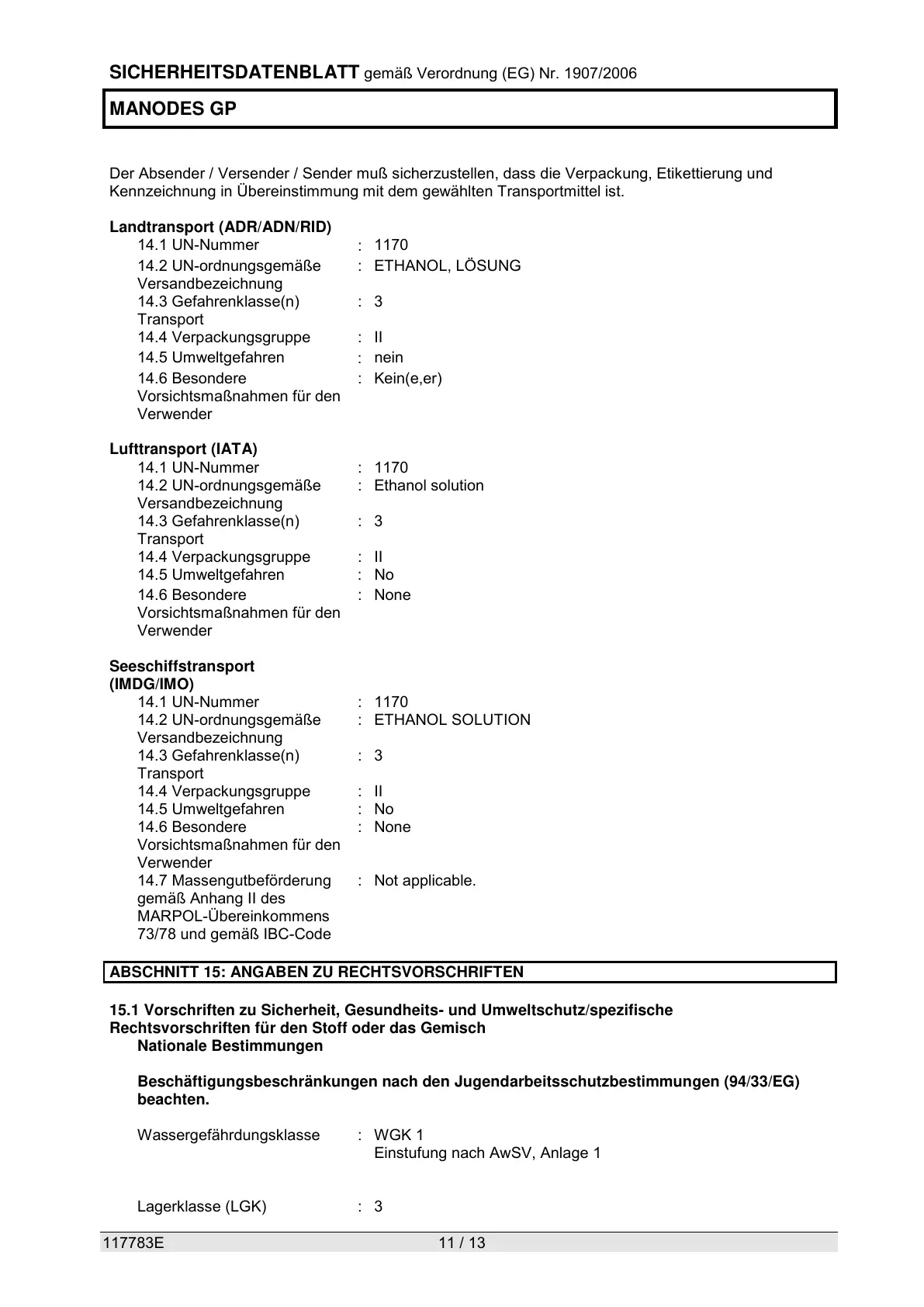 15.1 Vorschriften zu Sicherheit, Gesundheits- und Umweltschutz/spezifische