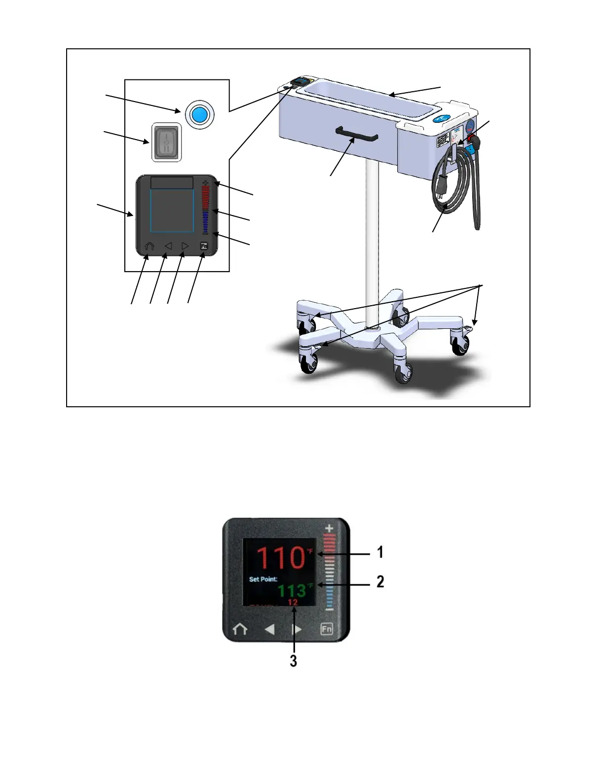 Refer to Figure 3. The home screen displays the Current fluid temperature (1) on the upper