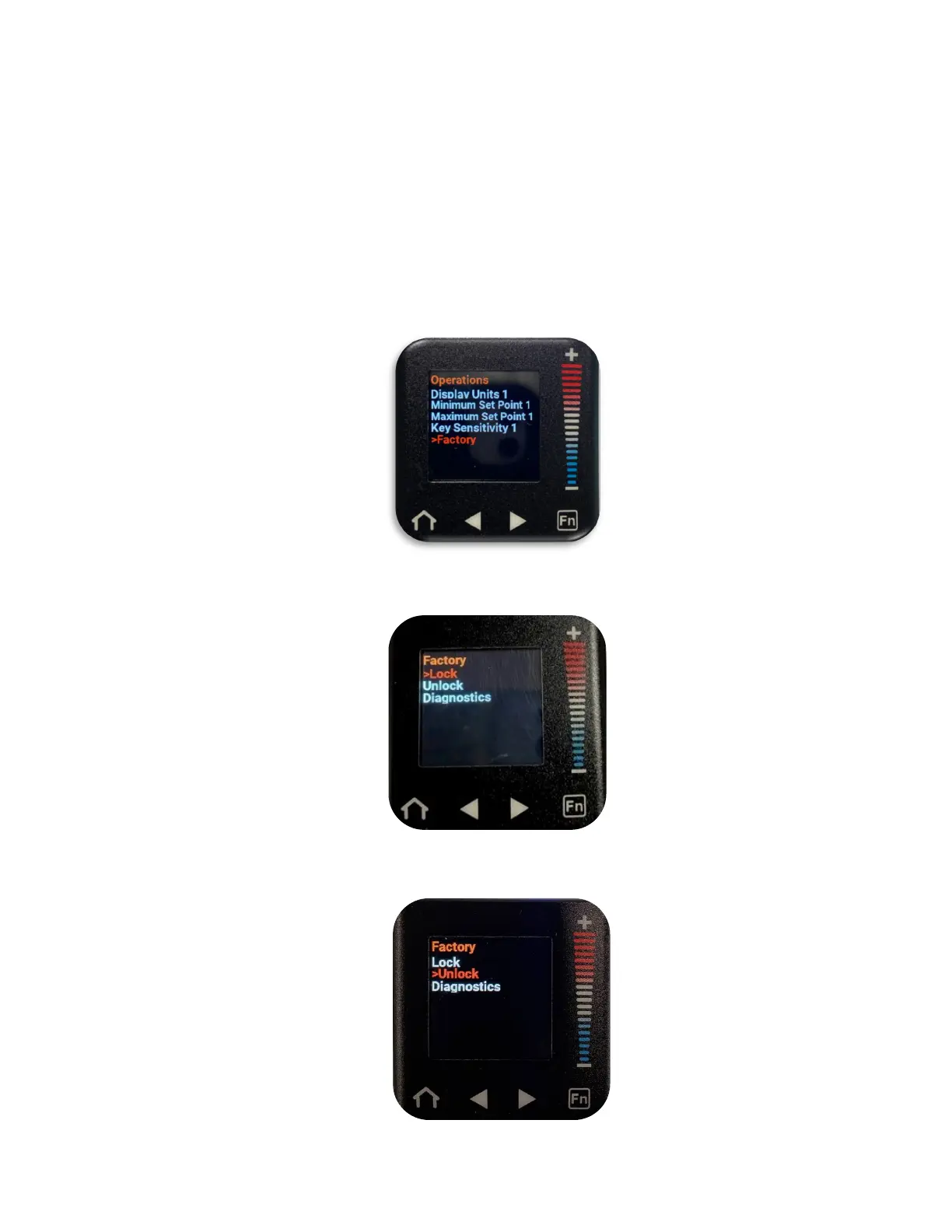b. Press the “–” button to scroll down to “Factory” (“Factory” will be in a red font when
