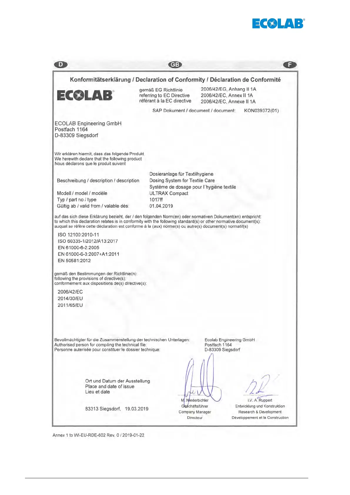 Ecolab ULTRAX Compact - 15 Konformitätserklärung
