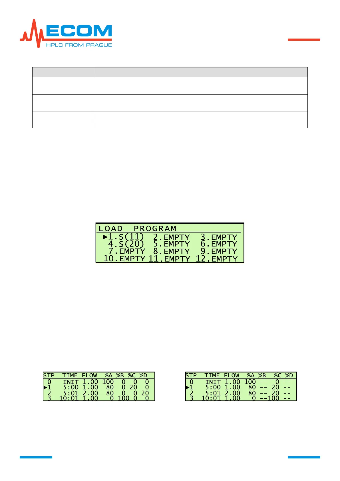 Sequence number of step, time (min:s) of step start, flowrate (ml/min), mobile phase