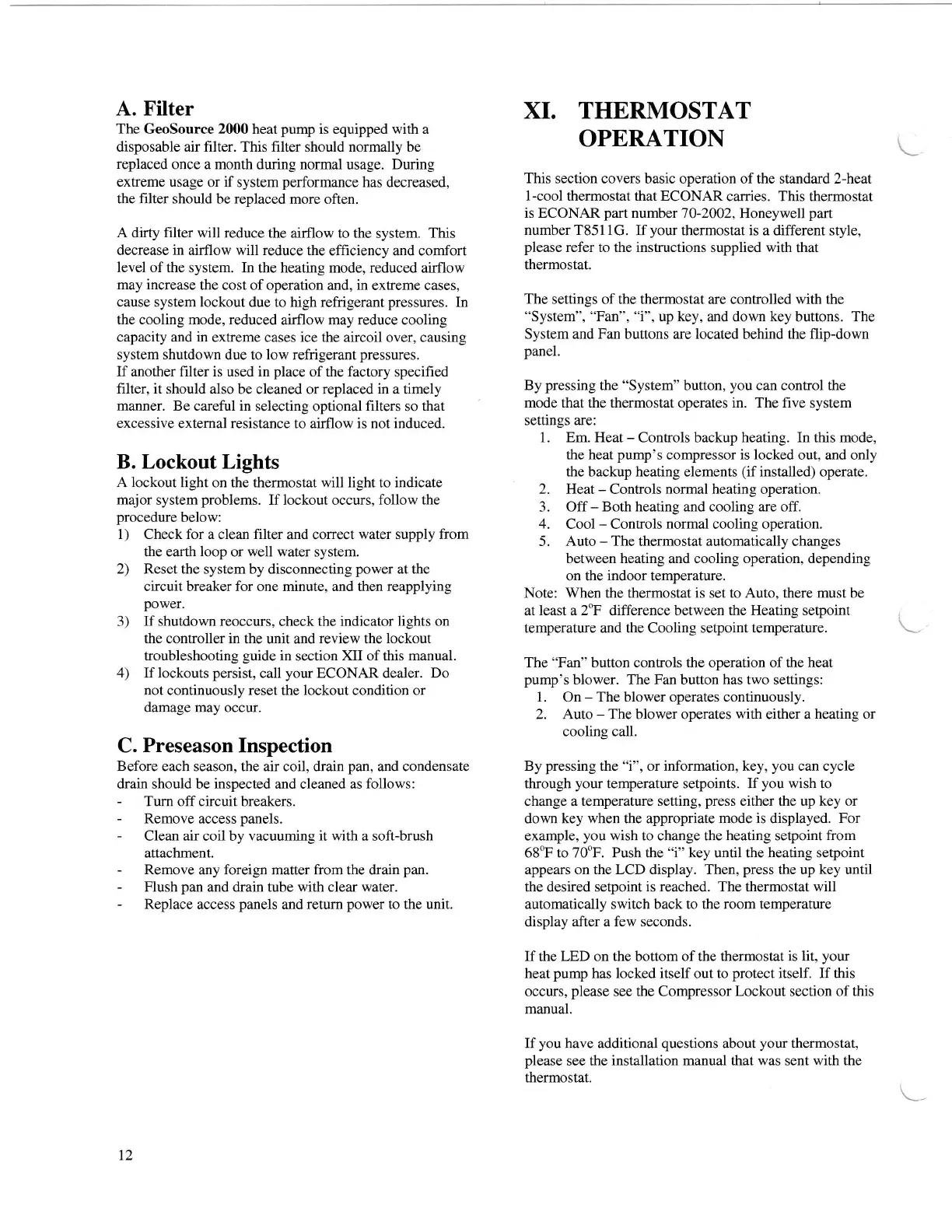 Econar GeoSource 2000 GV360 - XI. Thermostat Operation