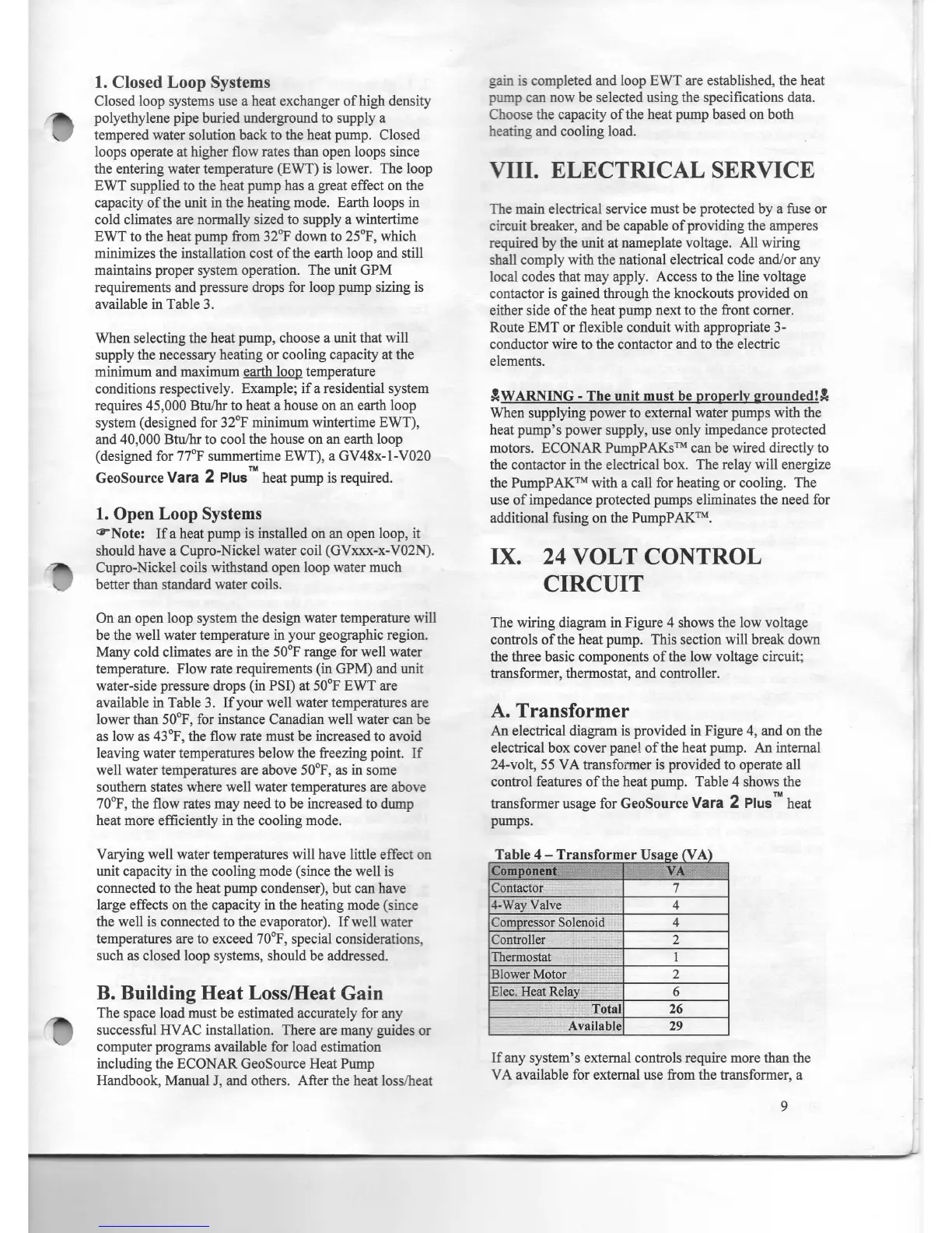 Econar GeoSource Vara 2 Plus - Unit Sizing Requirements; Loop Configuration and Design Water Temperatures; Building Heat Loss and Heat Gain; Electrical Service Information