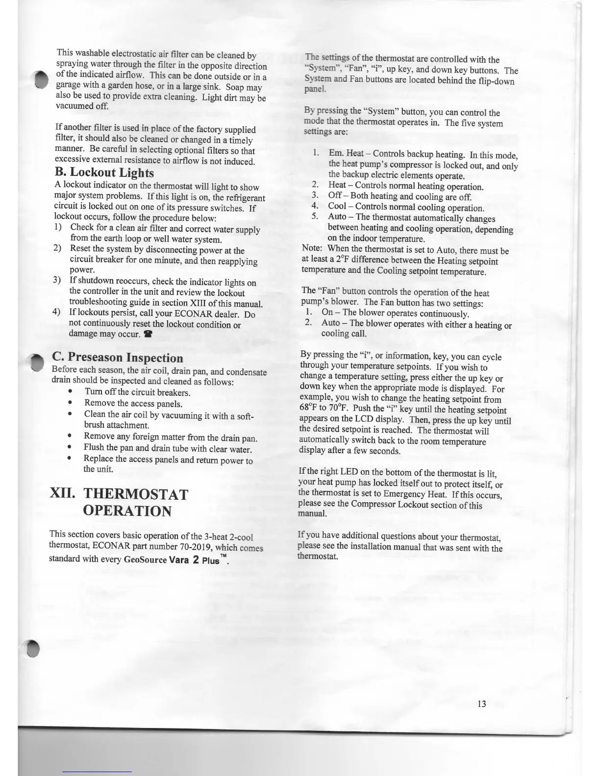 Econar GeoSource Vara 2 Plus - Service and Maintenance; Air Filter Maintenance; Lockout Lights Interpretation; Preseason Inspection Checklist