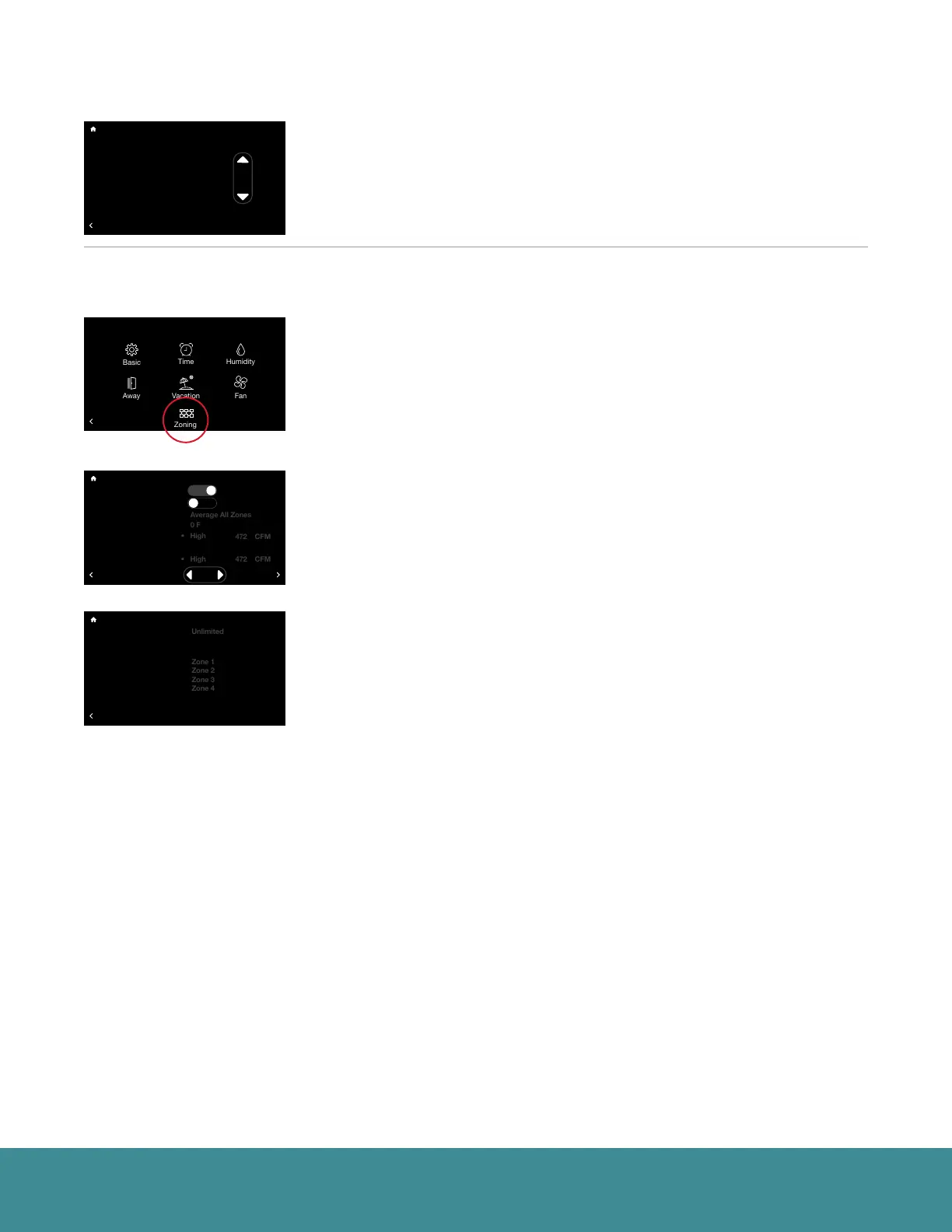 from the Smart Thermostat under Menu > Zoning, via the individual zone controls or through the