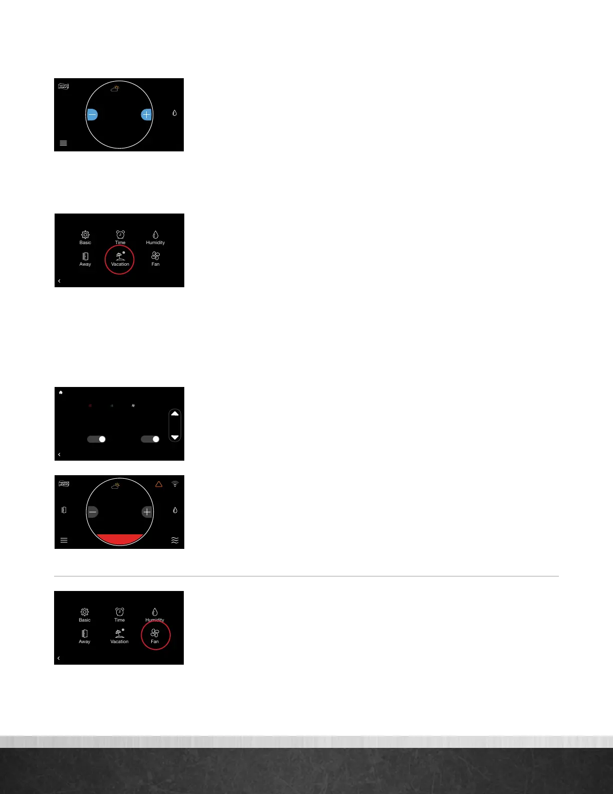 The Vacation screen allows you to preschedule desired heating, cooling and fan