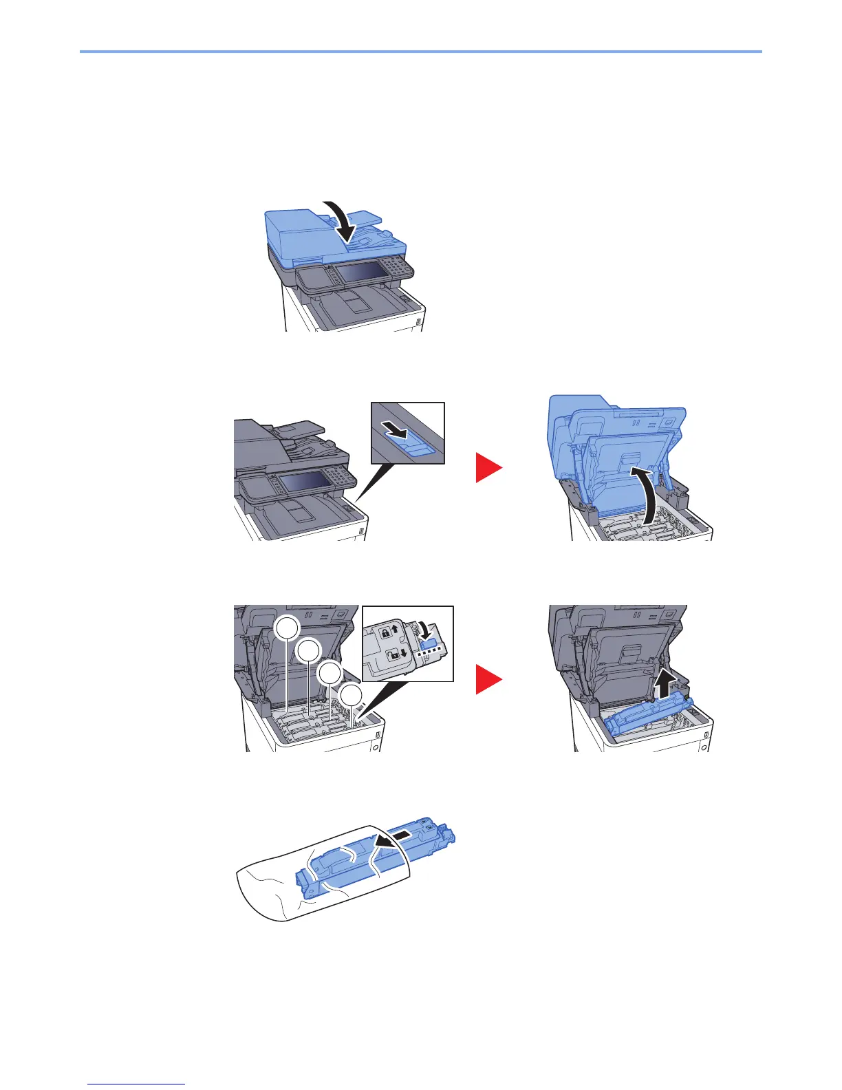 Installation procedures of the toner container is same for every color. The procedures here represent the yellow toner