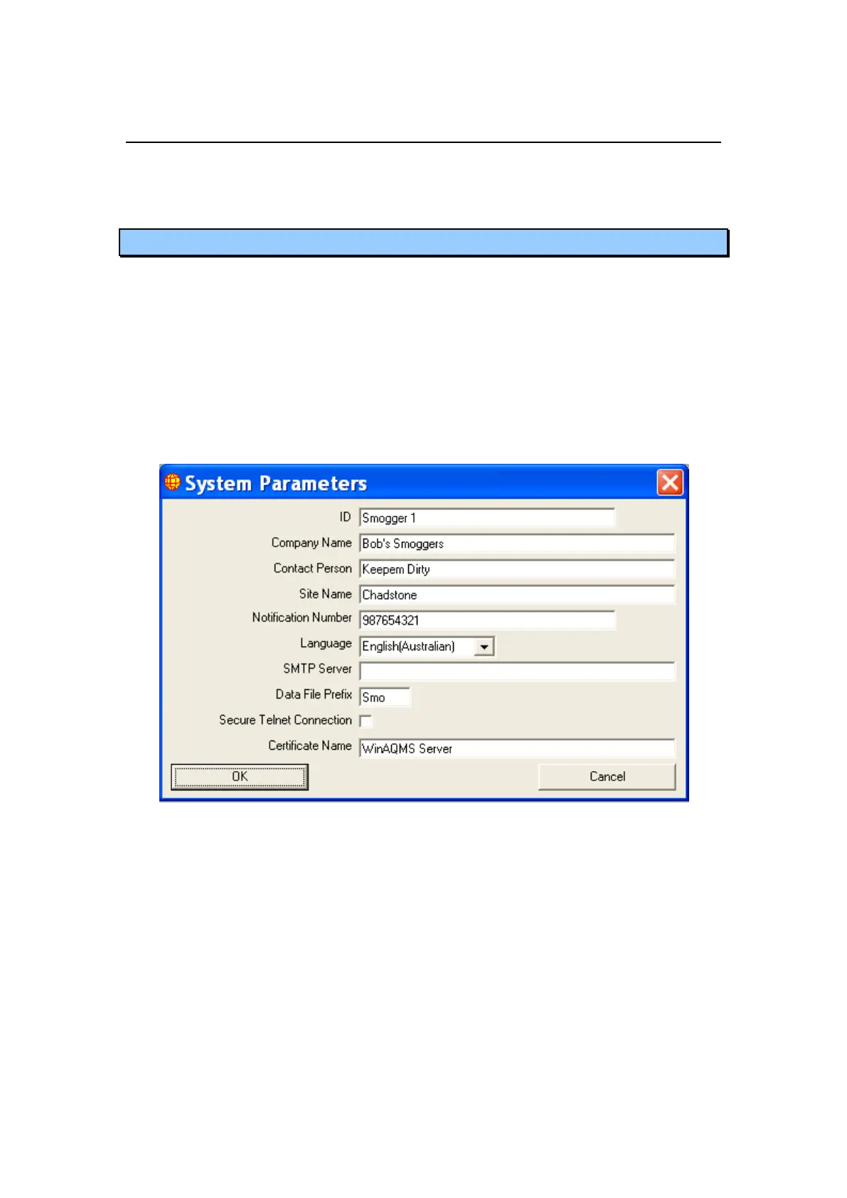 SMTP Server, the server name or IP address WinAQMS Mini DAS will use to