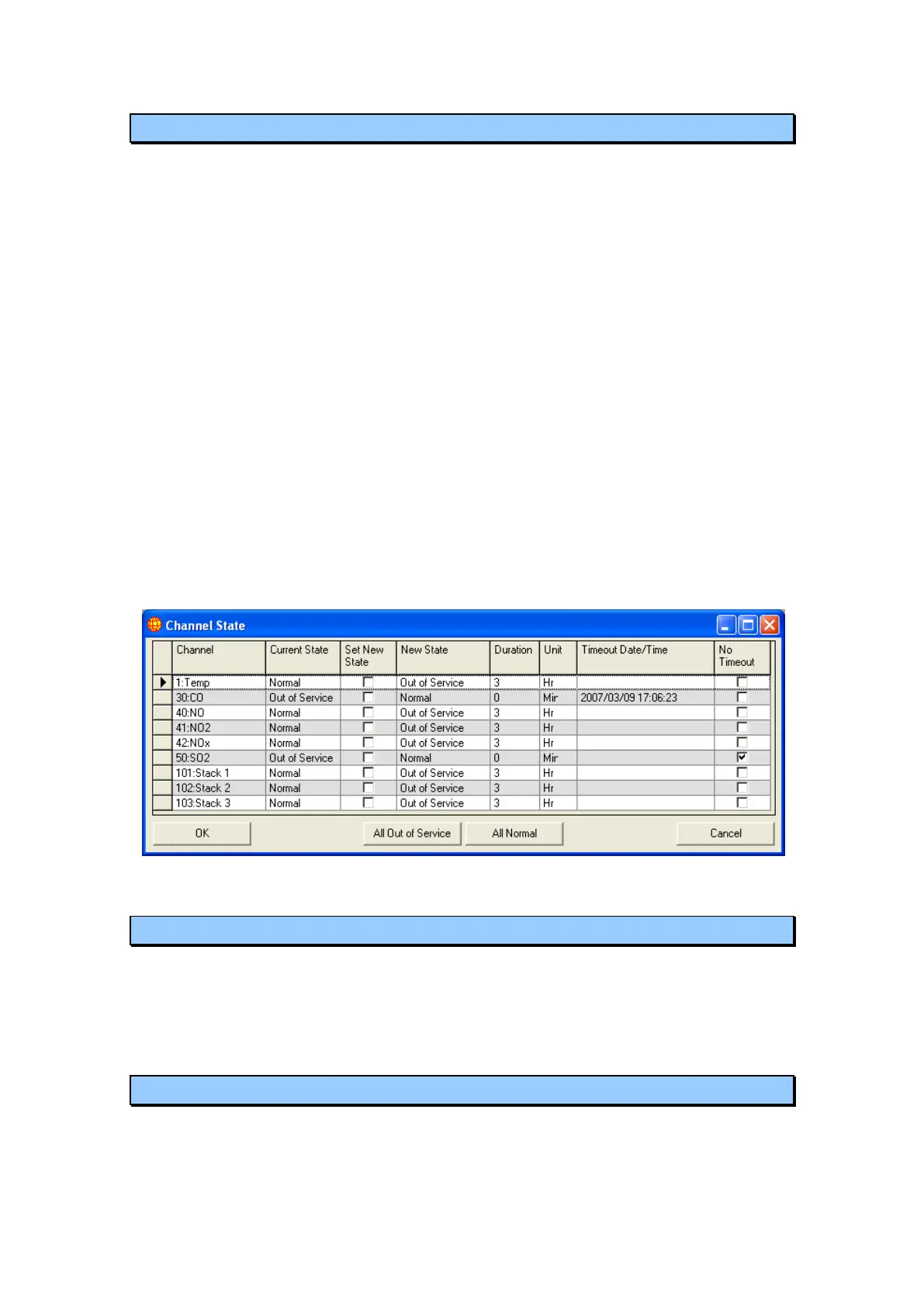 the New State listbox to Out of Service for all channels. The All Normal button will