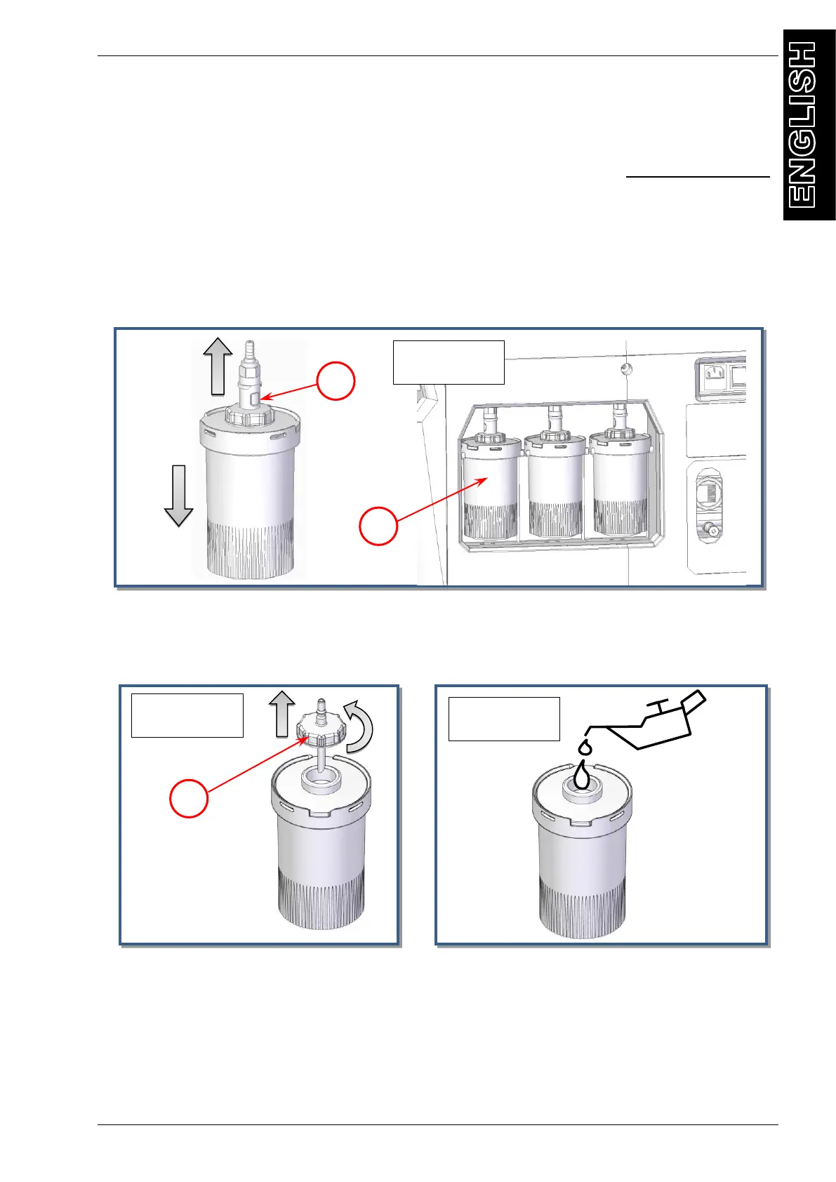 1. Press quick connection button (ref 1, Fig.25) to disconnect the oil container