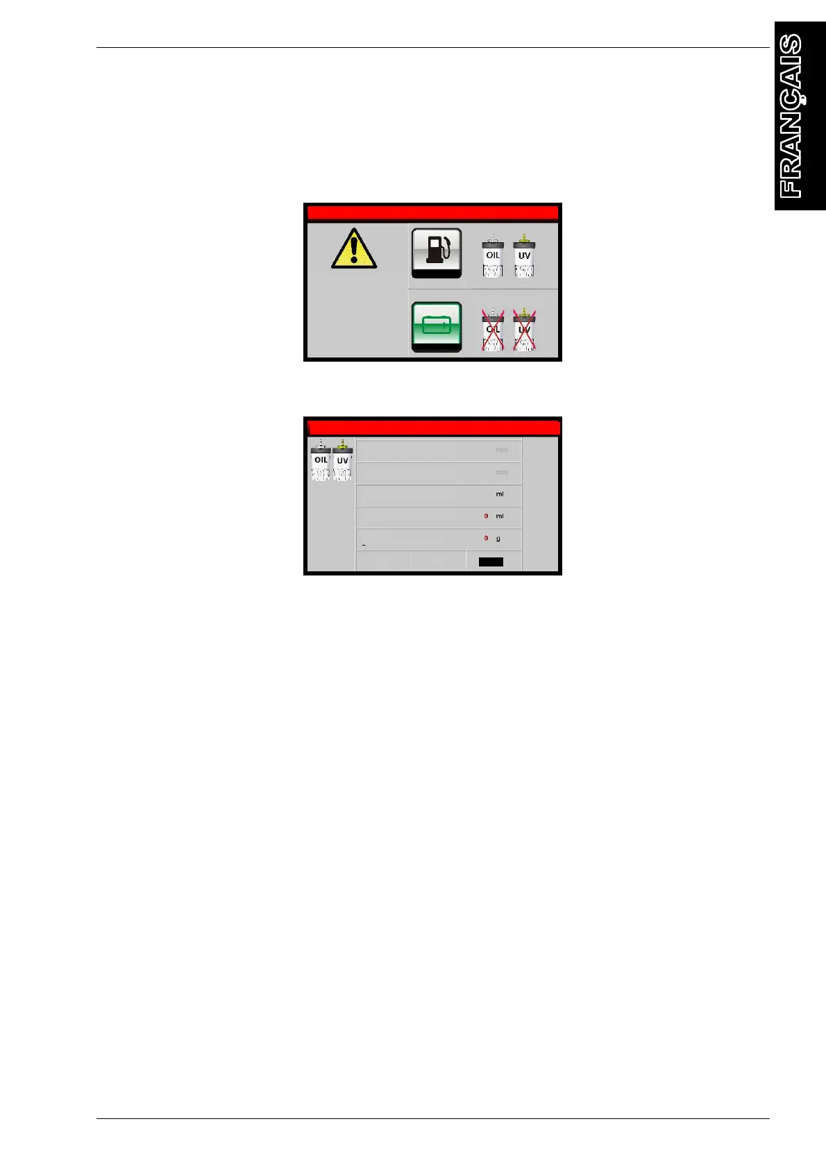 Dans PROCÉDURE MANUELLE sélectionner INJECTION HUILE + UV, l'écran suivant