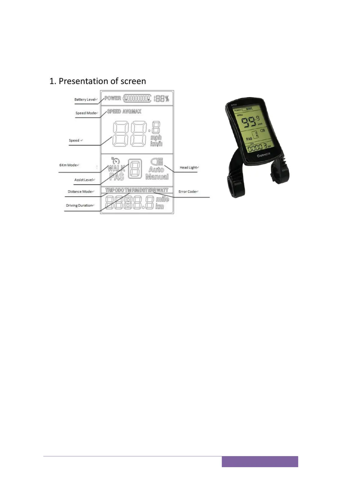 Long press down button to enter/quit 6km/h mode, “walk” will show up on