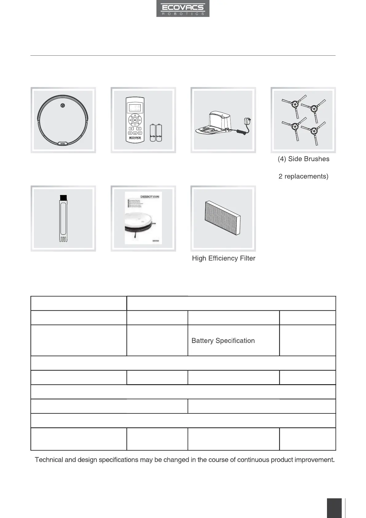 ECOVACS ROBOTICS Deebot DM82 - Package Contents and Technical Specifications; Package Contents; Technical Specifications