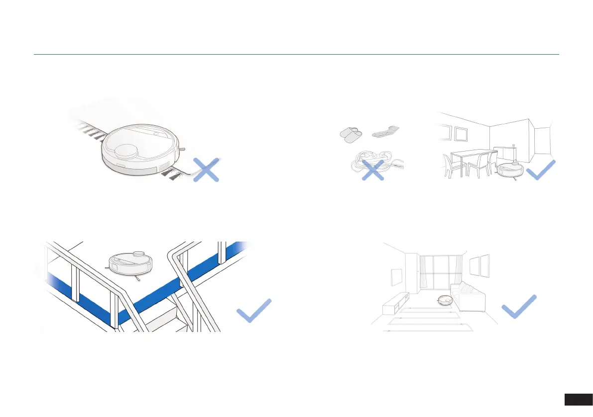 말, 전원 코드 등을 감지합니다. 청소할 구역이 충분히 밝은지 확인하고