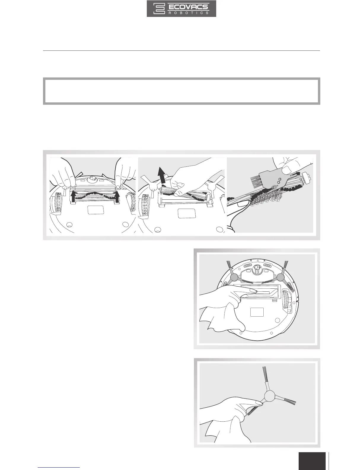로봇을 뒤집습니다 . 메인 브러시 덮개의 양쪽 버튼을 누르고 메인 브러시 덮개를 분리합니다 . 메
