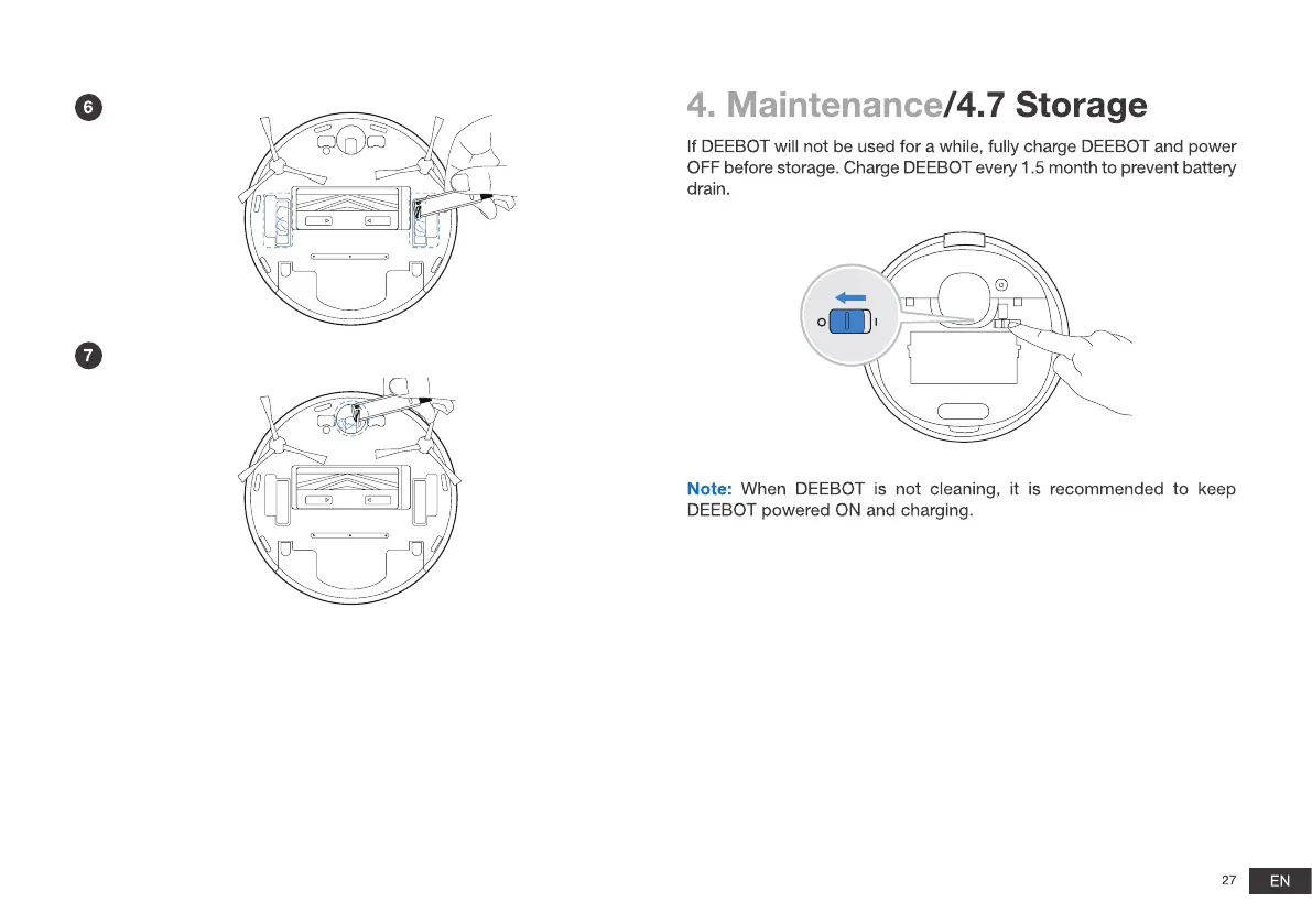 OFF before storage. Charge DEEBOT every 1.5 month to prevent battery