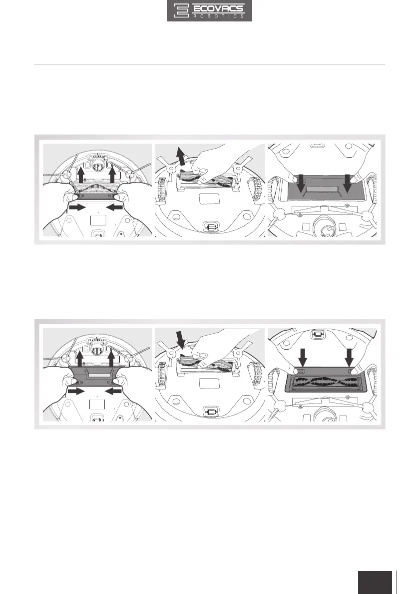 Retournez le robot. Appuyez sur les deux boutons de l’accessoire de la brosse principale et retirez