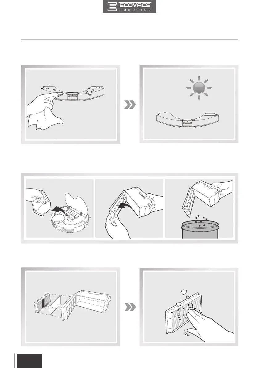 Abra la cubierta superior del DEEBOT y quite el depósito de polvo. Abra el cierre del depósito de