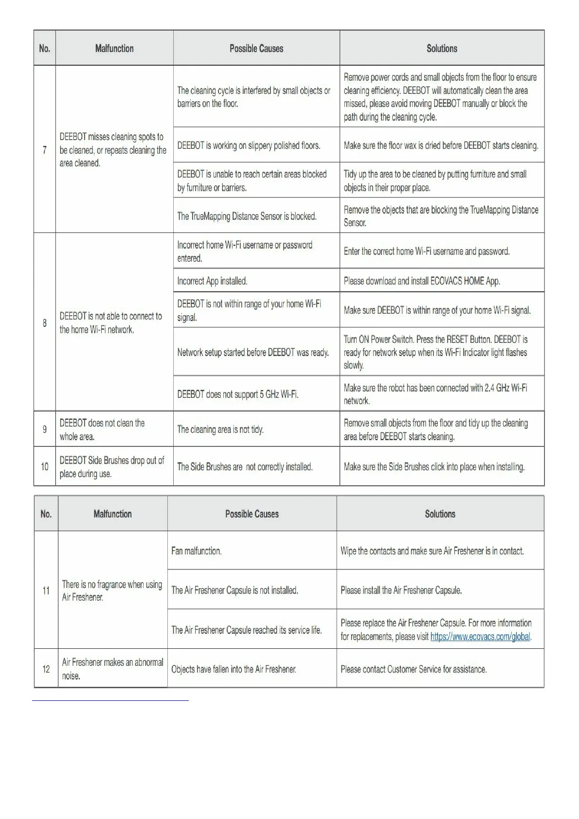 ECOVACS Deebot T9 - DEEBOT misses cleaning spots or repeats cleaning; DEEBOT is not able to connect to the home Wi-Fi network; DEEBOT does not clean the whole area; DEEBOT Side Brushes drop out of place during use