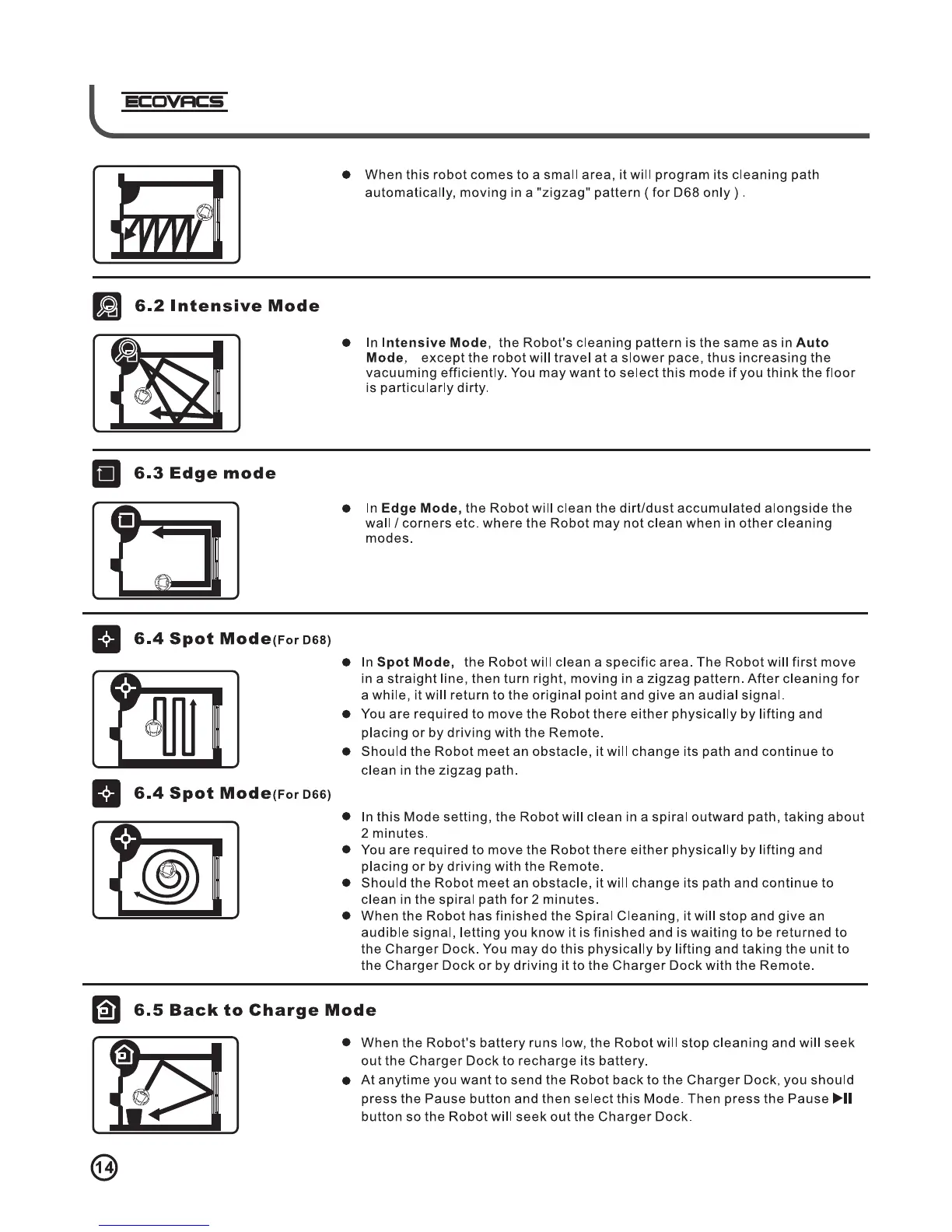 ECOVACS Deebot - Intensive Mode; Edge Mode; Spot Mode; Back to Charge Mode