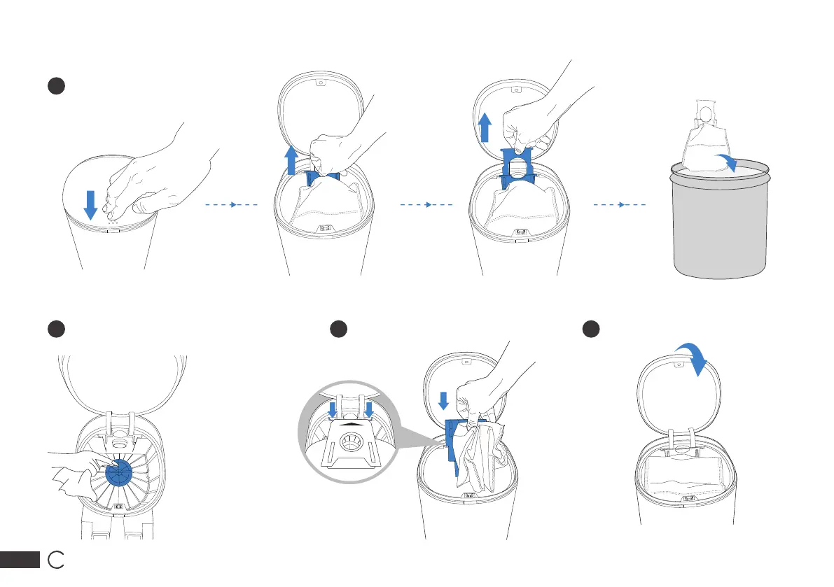 Oczyścić osłonę dmuchawy Włożyć worek na kurz Zamknąć pokrywę pojemnika na kurz