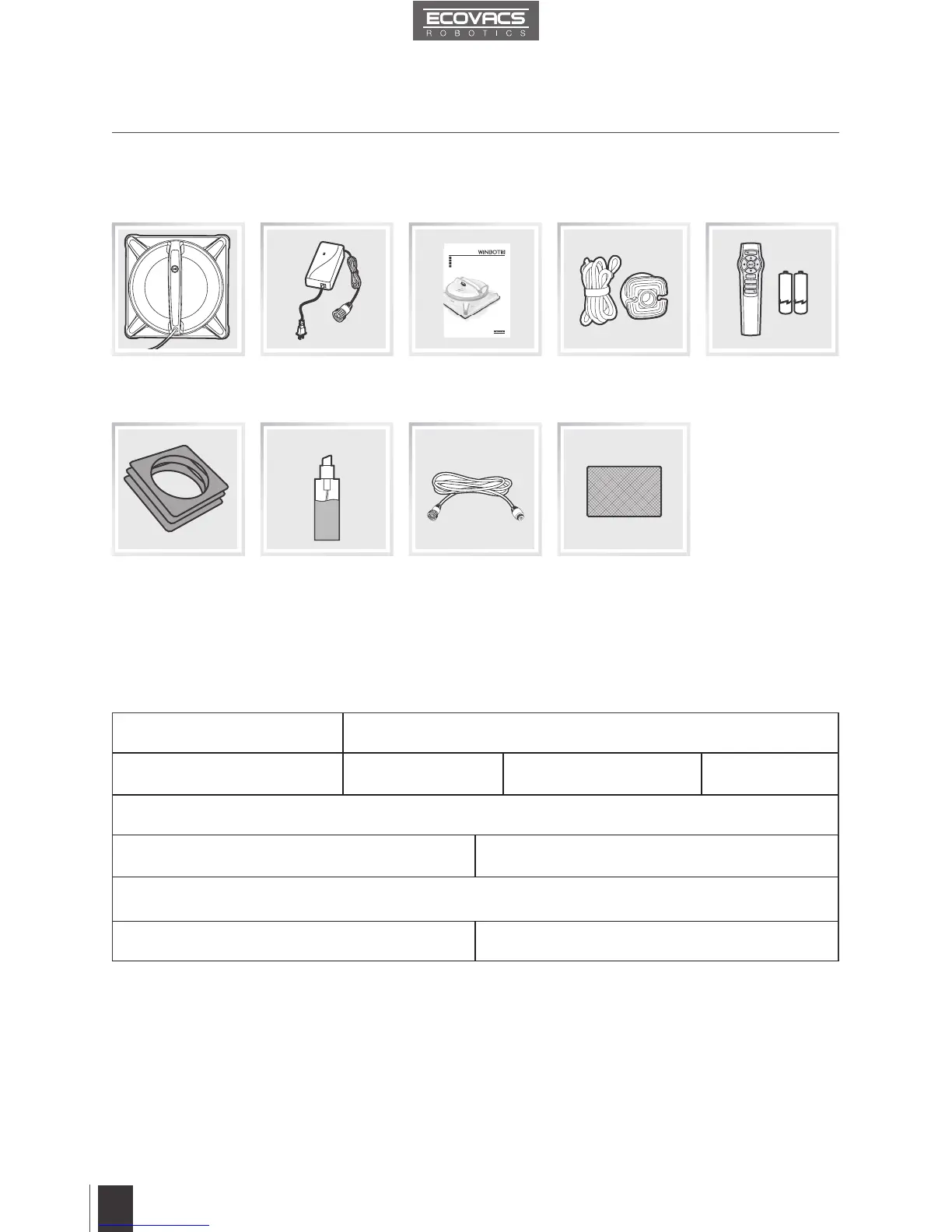 ECOVACS Winbot 9 - Package Contents and Technical Specifications; Package Contents; Technical Specifications