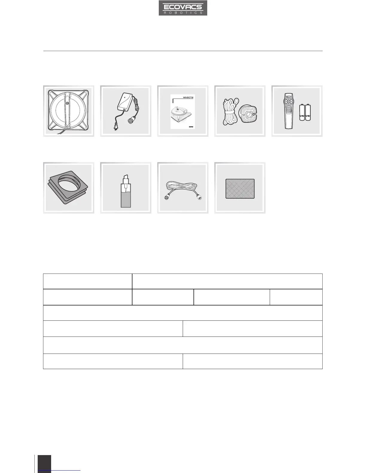 ECOVACS WINBOT 930 - Package Contents and Technical Specifications; Package Contents; Specifications