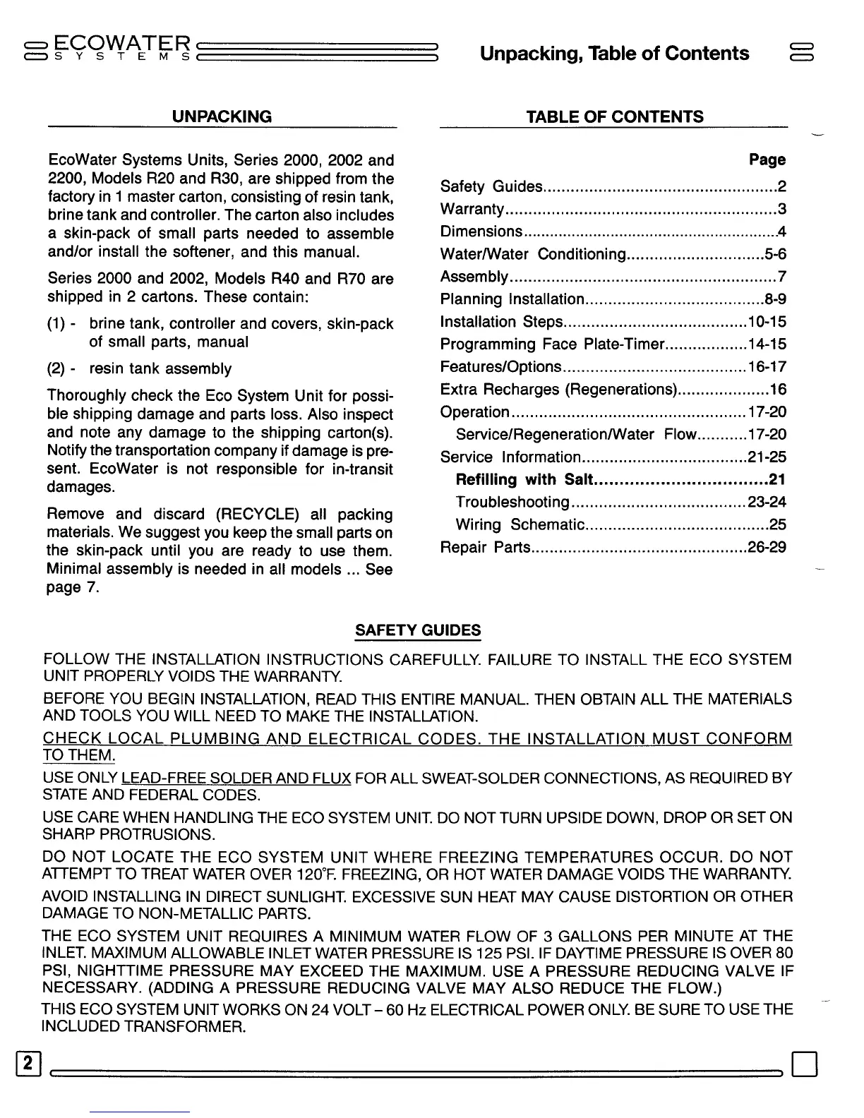 EcoWater R20 - Unpacking Your EcoWater System; Essential Safety Guidelines