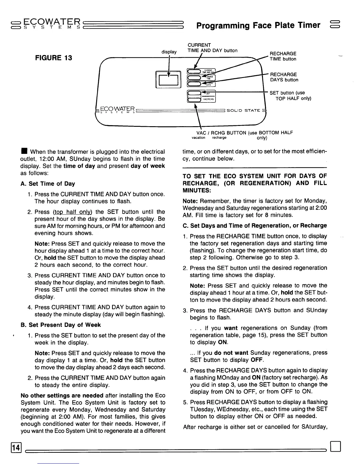 EcoWater R40 - PROGRAMMING THE FACE PLATE TIMER; SETTING CURRENT TIME AND DAY; CONFIGURING REGENERATION SCHEDULE