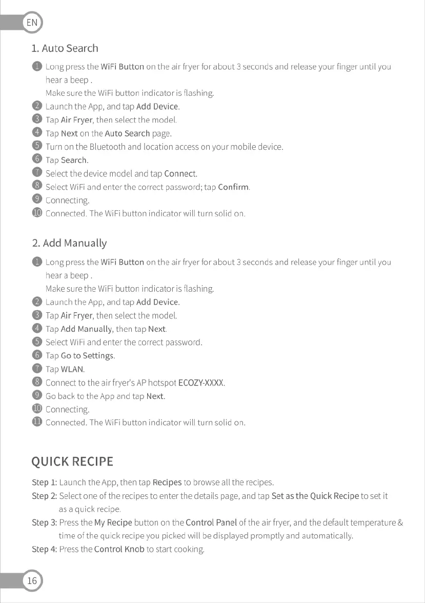 Ecozy AF-CT600B - WiFi Connection Methods; QUICK RECIPE; Setting and Using Quick Recipes