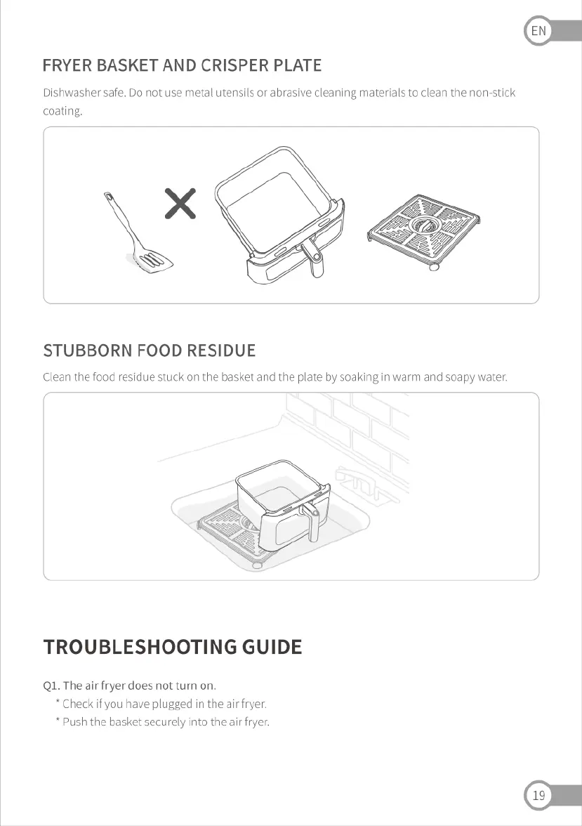 Ecozy AF-CT600B - FRYER BASKET AND CRISPER PLATE; Cleaning the Basket and Plate; STUBBORN FOOD RESIDUE; Removing Stubborn Residue