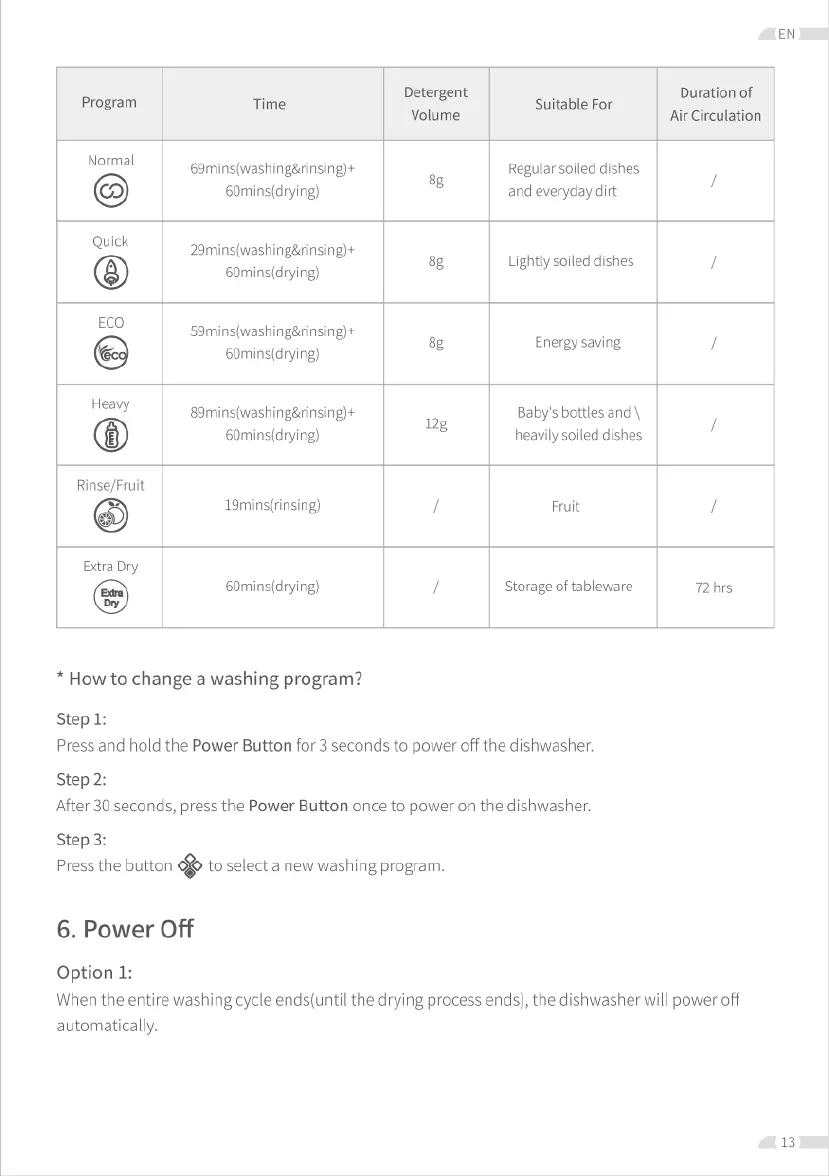 Ecozy DW01 - Washing Programs Overview; Power Off